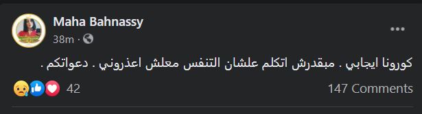 وكتبت المذيعة مها بهنسي: "كورونا إيجابي"، مشيرة إلى أنها لا تستطع الكلام حاليا بسبب مشاكل في التنفس، وطلبت من جمهورها الدعاء لها.