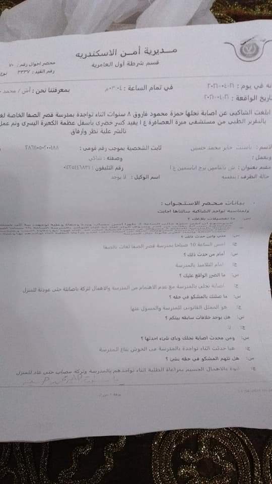 وحرر ولي الأمر محضر بهذه الواقعة ضد إدارة المدرسة، برقم 3337 لسنة 2021 بقسم شرطة أول العامرية، يتهمهم فيه بالإهمال والتسبب في إصابة ابنه، وذلك بعد حصوله على تقرير طبي بحالته الصحية من مستشفى مبرة العصافرة.