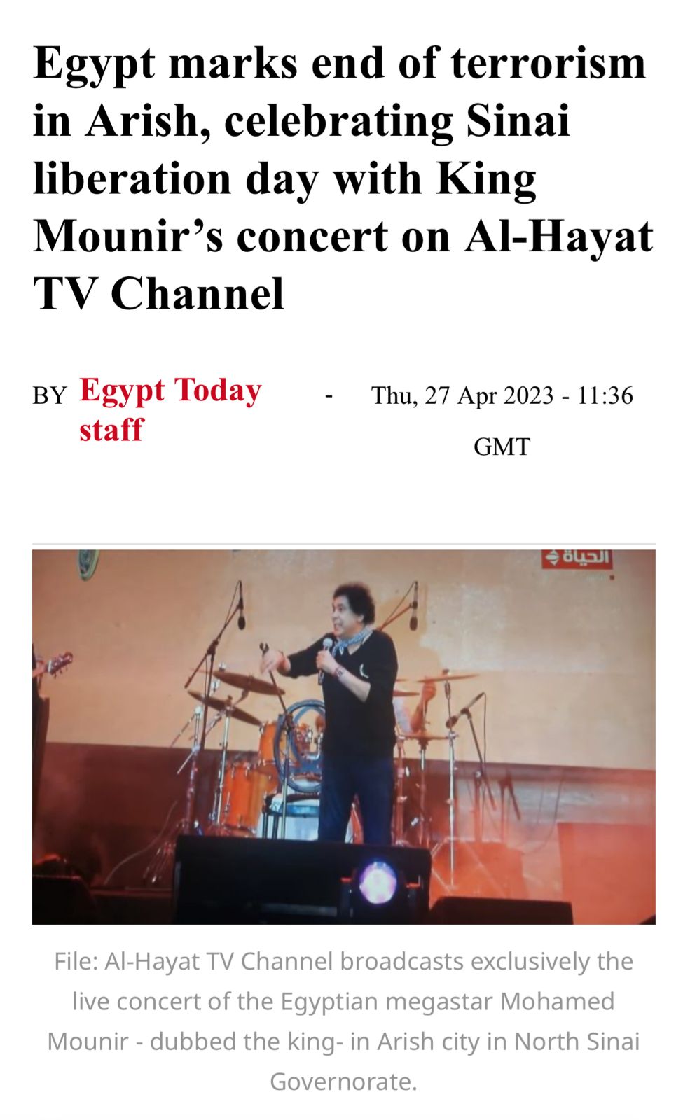 أشاد موقع إيجيبت توداي الناطق باللغة الإنجليزية بالبث الحي لشبكة تليفزيون الحياة لحفل الكينج محمد منير من مدينة العريش بمحافظة شمال سيناء، بالتزامن مع ذكرى تحرير سيناء، والتي تحتفل مصر ومحافظة شمال سيناء بها في يوم 25 أبريل من كل عام، وهي الاحتفالات التي تمتد حتى نهاية الشهر.