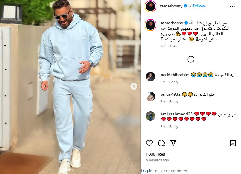 وشارك تامر حسني، جمهوره صور له عبر حسابه الشخصي بموقع إنستجرام، وعلق قائلًا: في الطريق إن شاء الله للكويت، متشوق جدًا لجمهور الكويت الغالي الحبيب حتى رايح مشي أهو عشان عيونكم.
