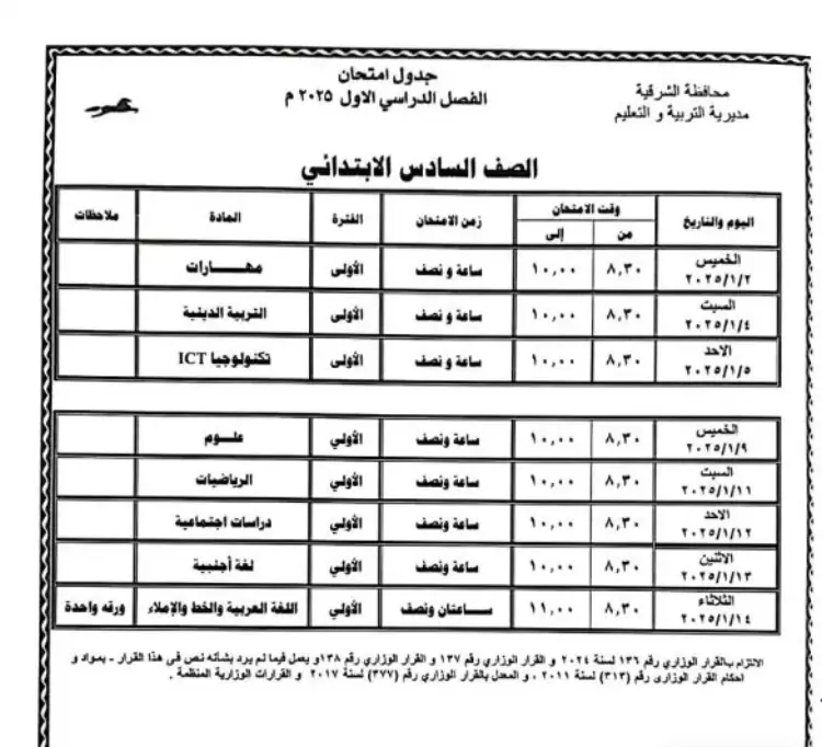 وعن جدول امتحانات نصف العام 2025 للصف السادس الابتدائي، فإن وزارة التربية والتعليم تتطلع إلى ضمان سير الامتحانات بسلاسة، مع مراعاة الظروف الخاصة لكل مرحلة دراسية، وتعزيز الجهود لتوفير بيئة امتحانية ملائمة لجميع الطلاب، وإليكم الجدول بشكل مفصل: