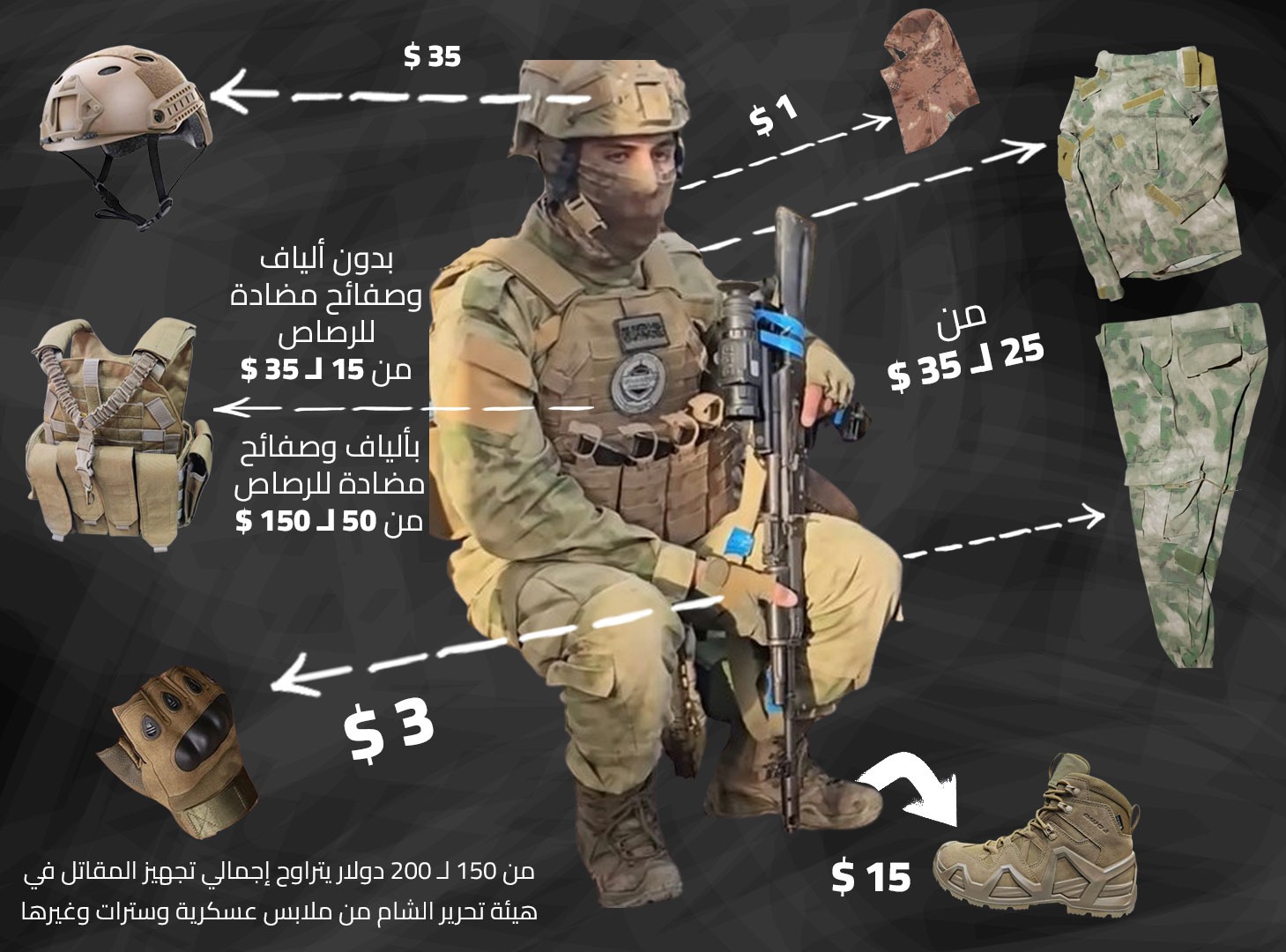 عرضنا الصورة السابقة لأحد مقاتلي هيئة تحرير الشام، على عدد من التجار المحليين، وكشفوا لنا أن معظم الملابس والمعدات التكتيكية محلية الصنع، فالبدلة المموهة من نوع أتاكس، والدرع تفصيل محلي ونسخة مطابقة للموديلات الأمريكية، وكذلك القناع، أما بالنسبة للحذاء والحزام والقفاز والخوذة فتم استيرادهم، وتم الحصول على بيان الأسعار التي تختلف من متجر لآخر ومن جديدة لمستعملة.