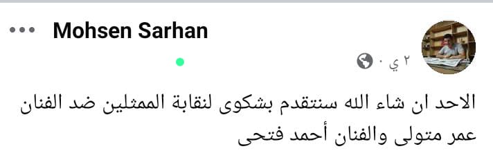 وكتب نجل شقيق شكري سرحان، عبر حسابه الشخصي بموقع فيسبوك: الأحد إن شاء الله سنتقدم بشكوى لنقابة الممثلين ضد الفنان عمر متولي والفنان أحمد فتحي.