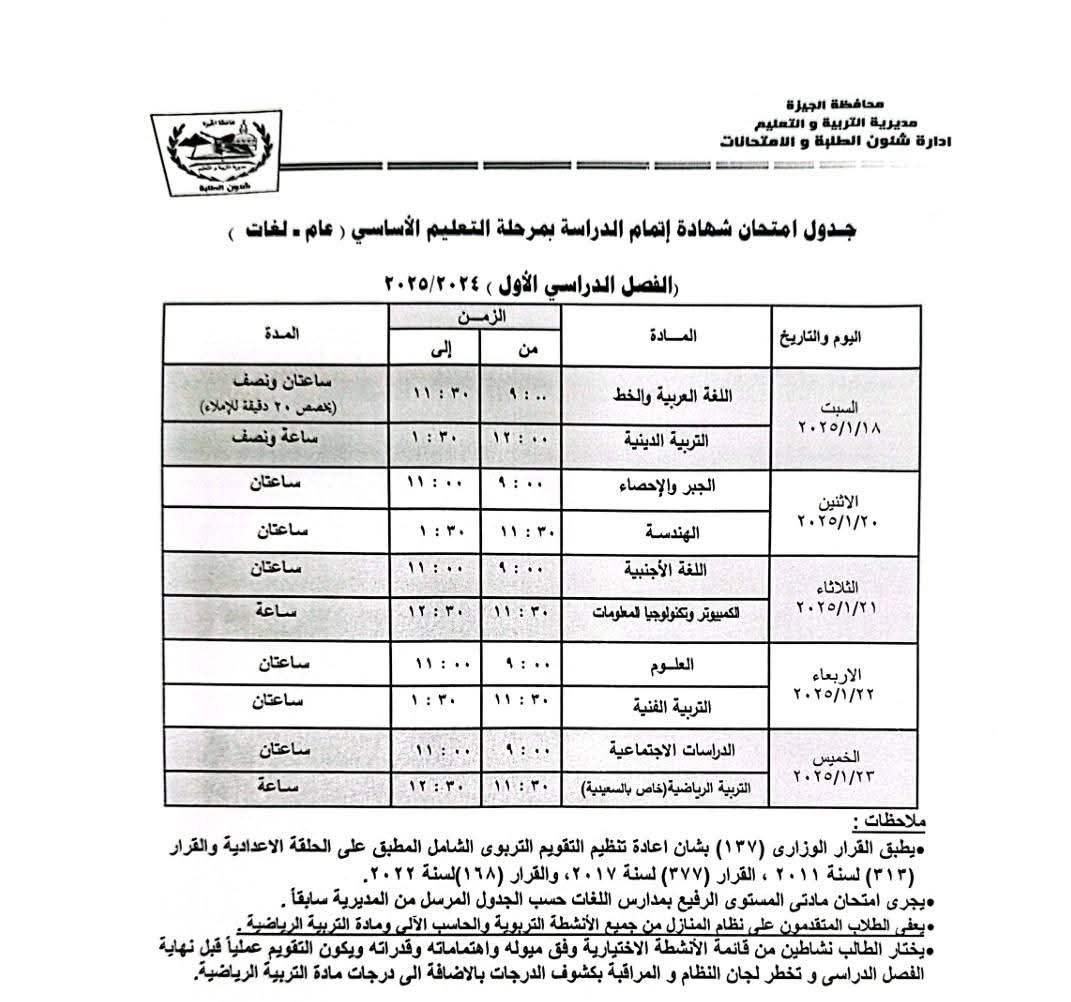 تبدأ السبت المقبل.. ننشر جداول امتحانات منتصف العام 2025 للشهادة الإعدادية بمحافظتي القاهرة والجيزة