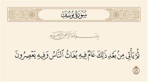 نقدم تفسير الآية الكريمة «ثم يأتي من بعد ذلك عام فيه يغاث الناس»، فقد جاءت في سورة يوسف تحديدًا الآية رقم 49، فهي جاءت تفسير رؤية الملك التي حيرت مستشاريه في قصة سيدنا يوسف عليه السلام، حيث تمثل هذه الآية جزءًا من تفسير يوسف لرؤية الملك التي تتنبأ بمستقبل مصر، حيث يتم وصف سنوات من الرفاهية تتبعها سنوات من الشدة، لينقلب الحال بعدها إلى فترة من الخيرات والنعم.