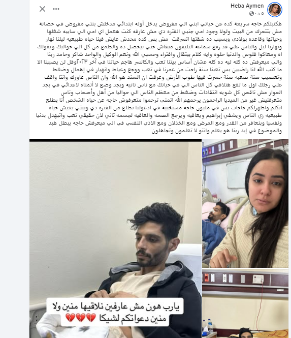 وأضافت: الكانسر هاجم حياتنا في آخر 2023 وقل لن يصيبنا إلا ما كتب الله لنا راضيين بس تعبنا سنة راحت من عمرنا في تعب ووجع وعياط وانهيار في إهمال وضغط وتعصيب سنة صعبه سنة خسرت فيها طوب الأرض، وعرفت إن السند هو الله وأن الناس عاوزك وانتا واقف على رجلك، أول ما تقع هتلاقي كل الناس الي في حياتك مع ناس تانية وبجد وضع لا أتمناه لأعدائي في بجد الحوار مش ناقص كل شويه انتقادات وضغط من معظم الناس اللي حواليا من أهل وأصحاب وناس متعرفنيش غير من الميديا الراحمون يرحمهم الله.
