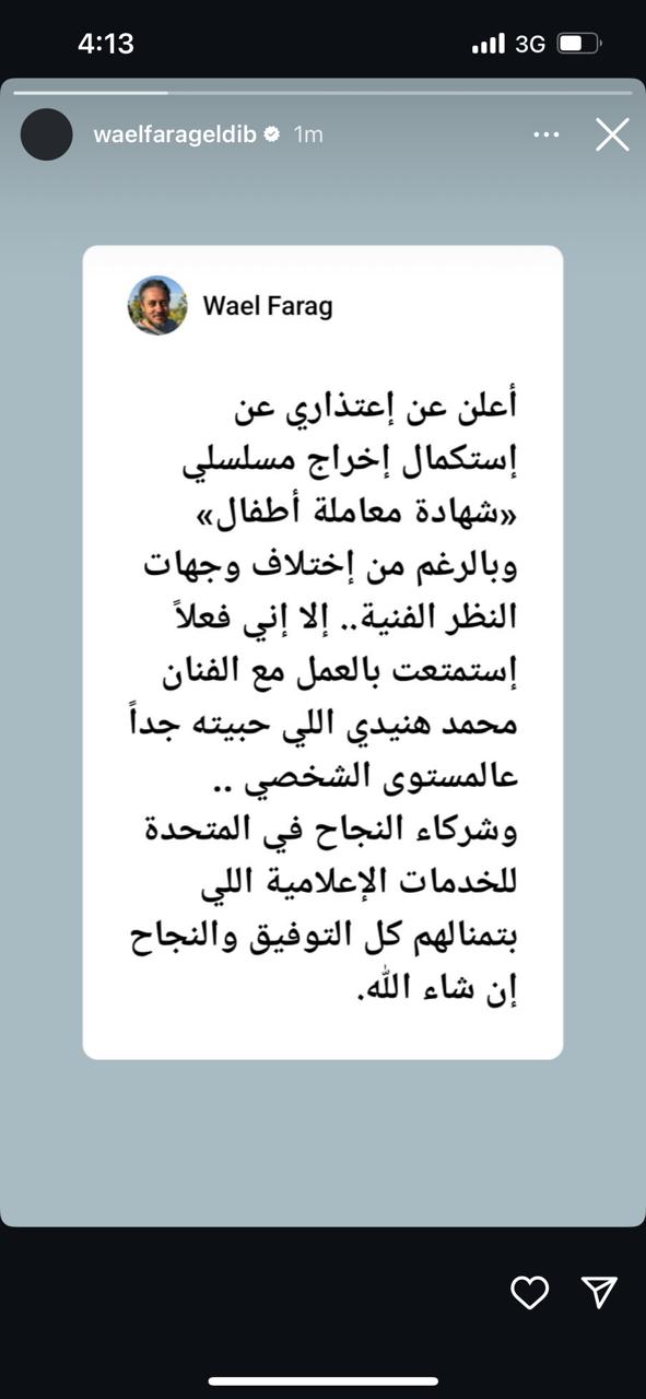 وكتب وائل فرج، عبر ستوري حسابه بموقع إنستجرام: أعلن اعتذاري عن استكمال إخراج مسلسلي شهادة معاملة أطفال، وبالرغم من اختلاف وجهات النظر الفنية.. فإني استمتعت بالعمل مع الفنان محمد هنيدي اللي حبيته جدًا على المستوى الشخصي.