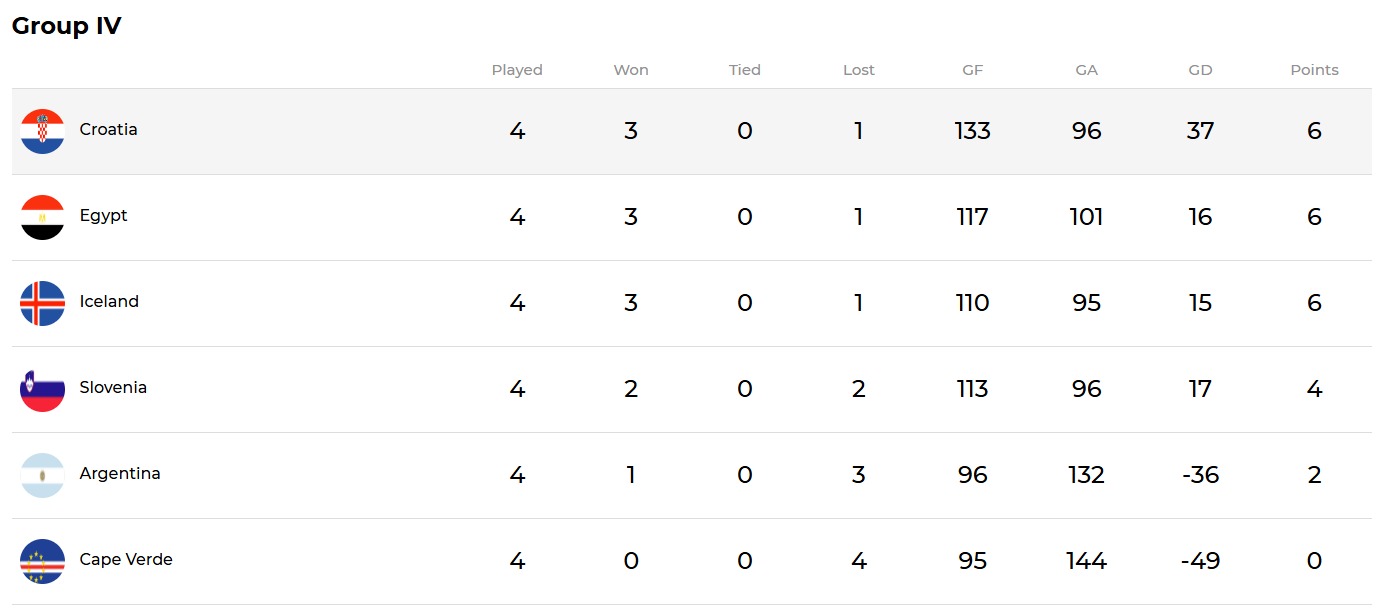 ويوجد المنتخب المصري في المجموعة الرابعة بالدور الرئيسي والذي تضم كل من: مصر، كرواتيا، الأرجنتين، سلوفينيا، أيسلندا، والرأس الأخضر.