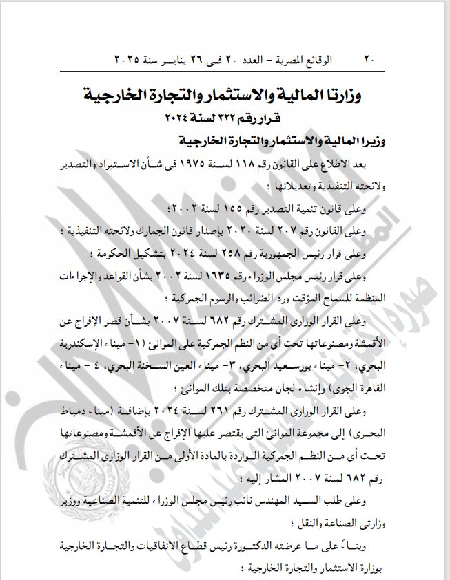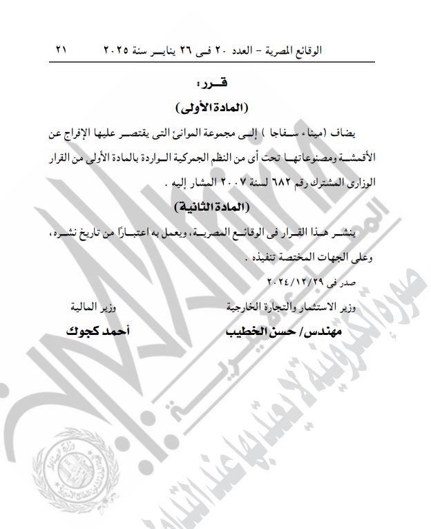 نشرت الجريدة الرسمية، اليوم الأحد، قرار وزيري المالية والاستثمار رقم 322 لسنة 2024، بشأن إضافة ميناء سفاجا إلى مجموعة الموانئ التي يقتصر الإفراج عن الأقمشة ومصنوعاتها تحت أي من النظم الجمركية الواردة بالمادة الأولى من القرار الوزاري المشترك رقم 682 لسنة 2007.