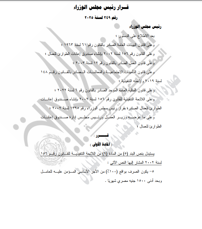 ونصت المادة الأولى من القرار على أن يستبدل بنص البند 5 من المادة 9 من اللائحة التنفيذية لقانون إنشاء صندوق إعانات الطوارئ للعمال رقم 156 لسنة 2002، النص الأتي: يكون الصرف بواقع 100% من الأجر الأساسي المؤمن عليه للعامل بحد أدنى 1500 جنيه مصري شهريًا.