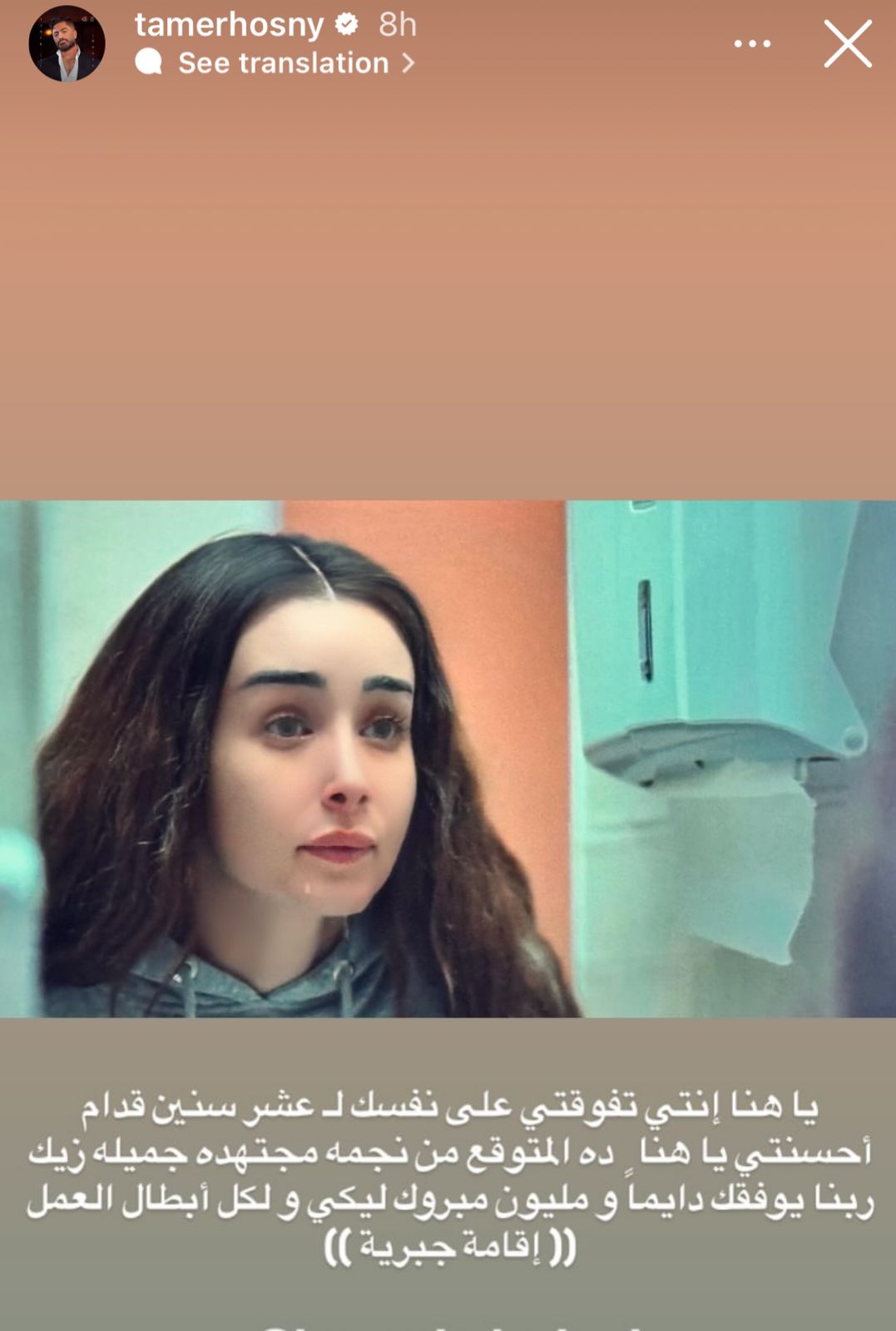 وكتب تامر حسني في خاصية القصص القصيرة عبر حسابه الرسمي بـ موقع تبادل الصور والفيديوهات إنستجرام: ياهنا إنتي تفوقتي على نفسك لـ عشر سنين قدام أحسنتي ياهنا وده المتوقع من نجمة مجتهدة وجميلة زيك، ربنا يوفقك دايمًا ومليون مبروك ليكي ولكل أبطال عمل إقامة جبرية.