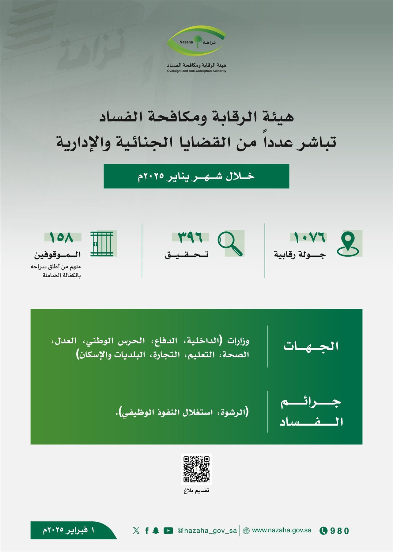 كشفت هيئة الرقابة ومكافحة الفساد بالمملكة العربية السعودية، عن أنها باشرت خلال شهر يناير 2025، اختصاصاتها ومهامها من خلال عمل 1076 جولة رقابية، والتحقيق مع 396 مشتبهًا فيه؛ من ضمنهم موظفون من وزارات: الداخلية، الدفاع، الحرس الوطني، الصحة، العدل، التعليم، التجارة، البلديات والإسكان.