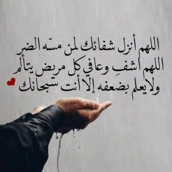 - اللهم اشفه شفاءً ليس بعده سقم أبدًا، اللهم خذ بيده، اللهمّ احرسه بعينك التي لا تنام، واكفه بركنك الذي لا يرام، واحفظه بعزك الذي لا يضام، واكلأه في الليل والنهار، وارحمه بقدرتك عليه، وارحمه بقدرتك عليه، أنت ثقته ورجاؤه، يا كاشف الهم، يا مفرج الكرب، يا مجيب دعوة المضطرين، اللهم ألبسه الصحة والعافية عاجلًا غير آجل، يا أرحم الراحمين، اللهم اشفه، اللهم اشفه، اللهم اشفه.
