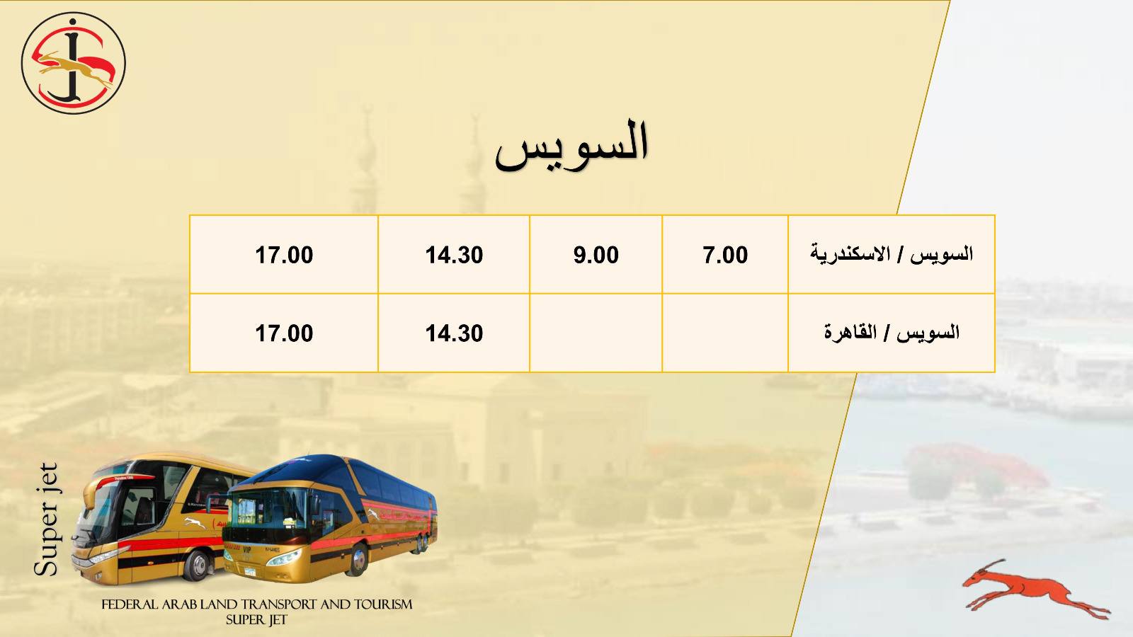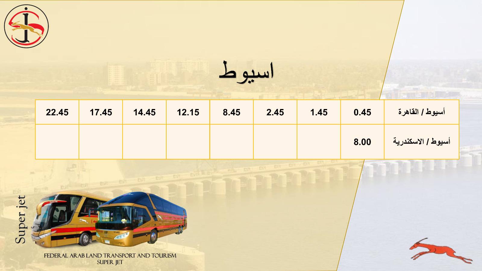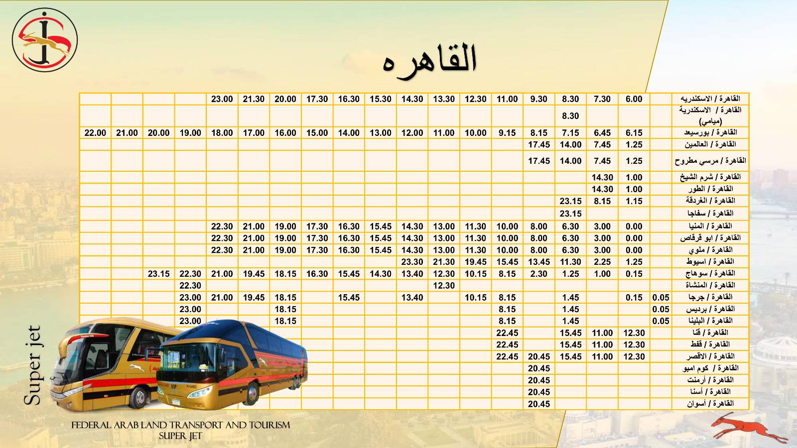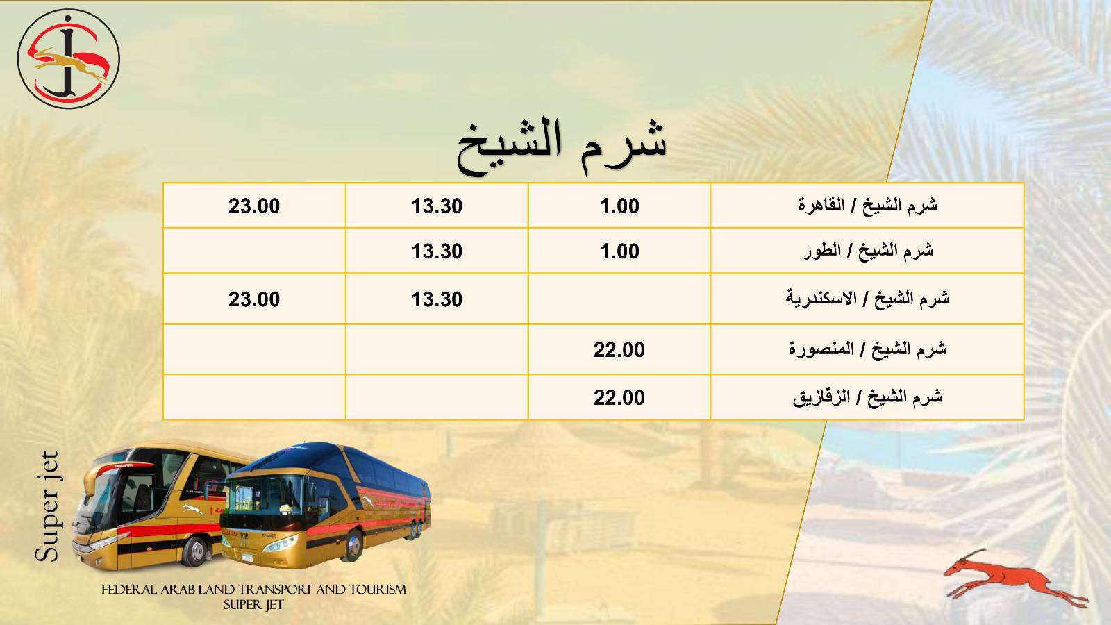 تُسير شركة الاتحاد العربي للنقل البري والسياحة سوبر جيت، إحدى الشركات التابعة لوزارة النقل، عدد من خدمات نقل الركاب الداخلية والخارجية إلى مختلف المحافظات من خلال أسطول من الحافلات المتميزة، كما تمتلك العديد من المحطات الذكية وأنظمة الحجز الإلكتروني.