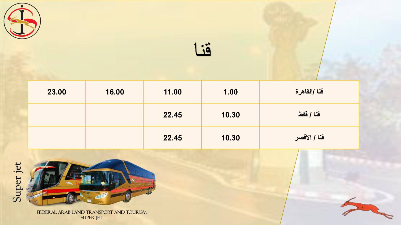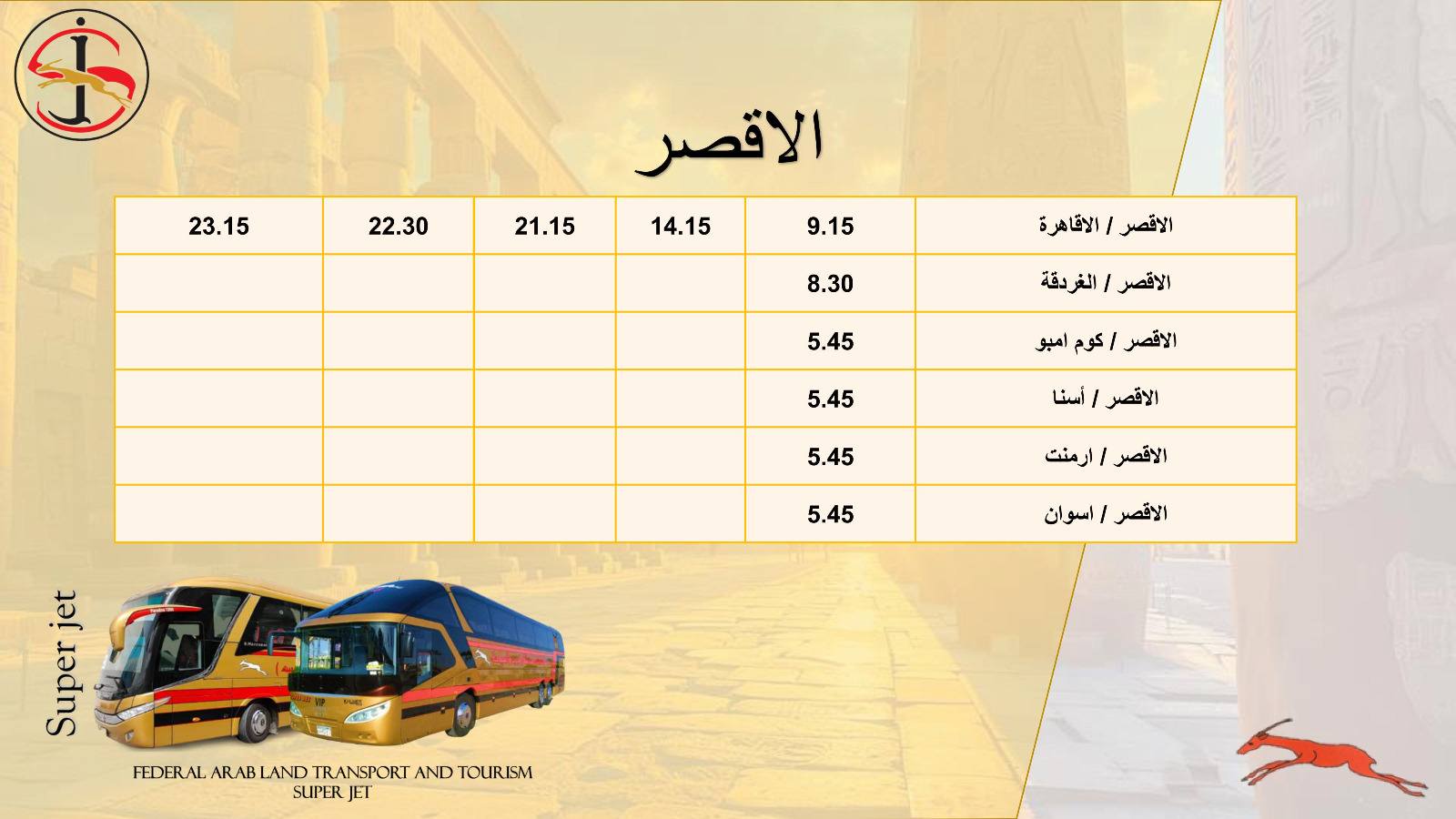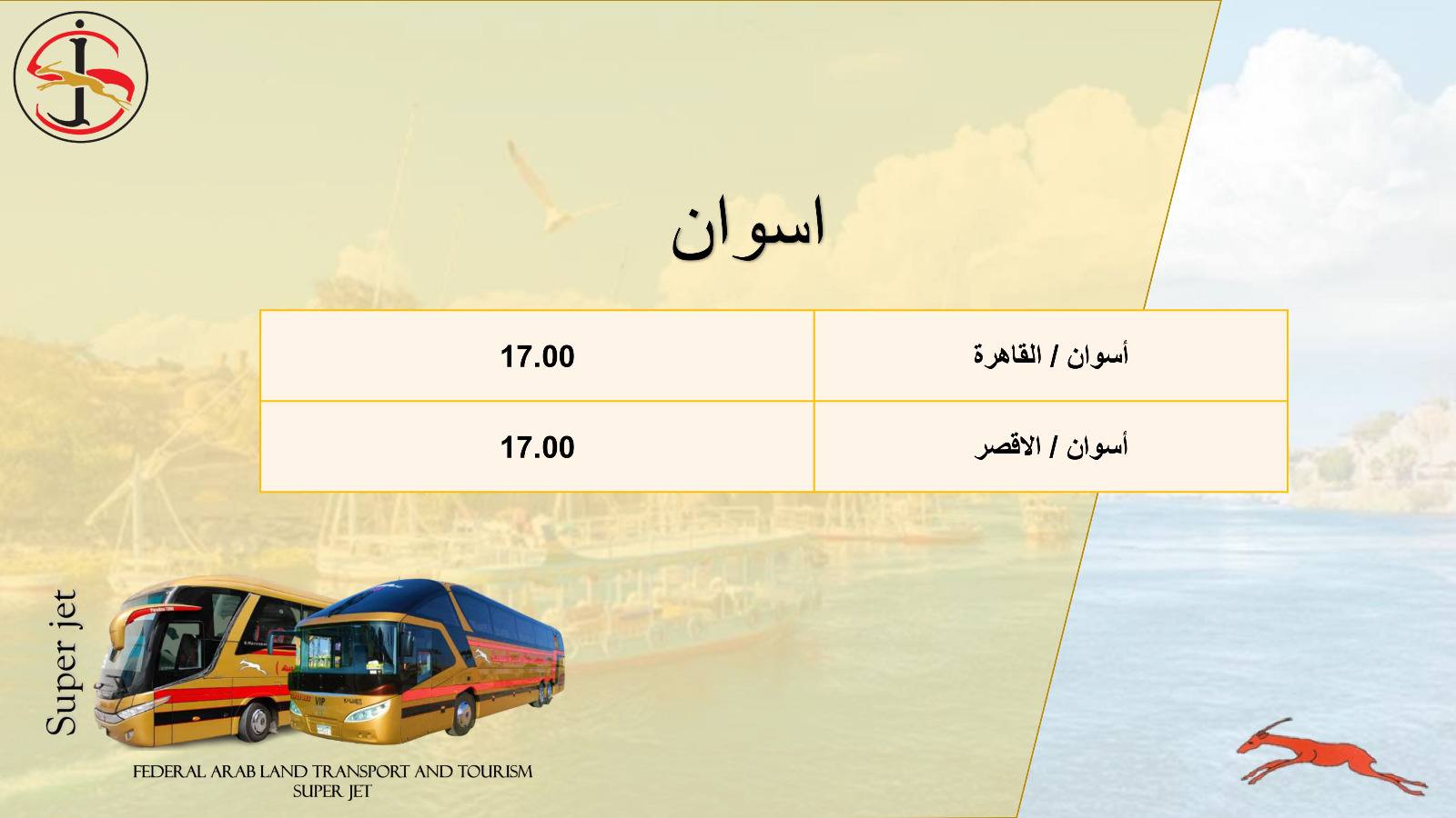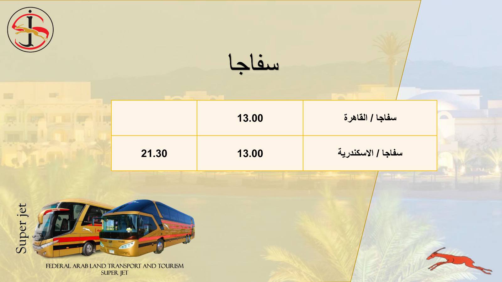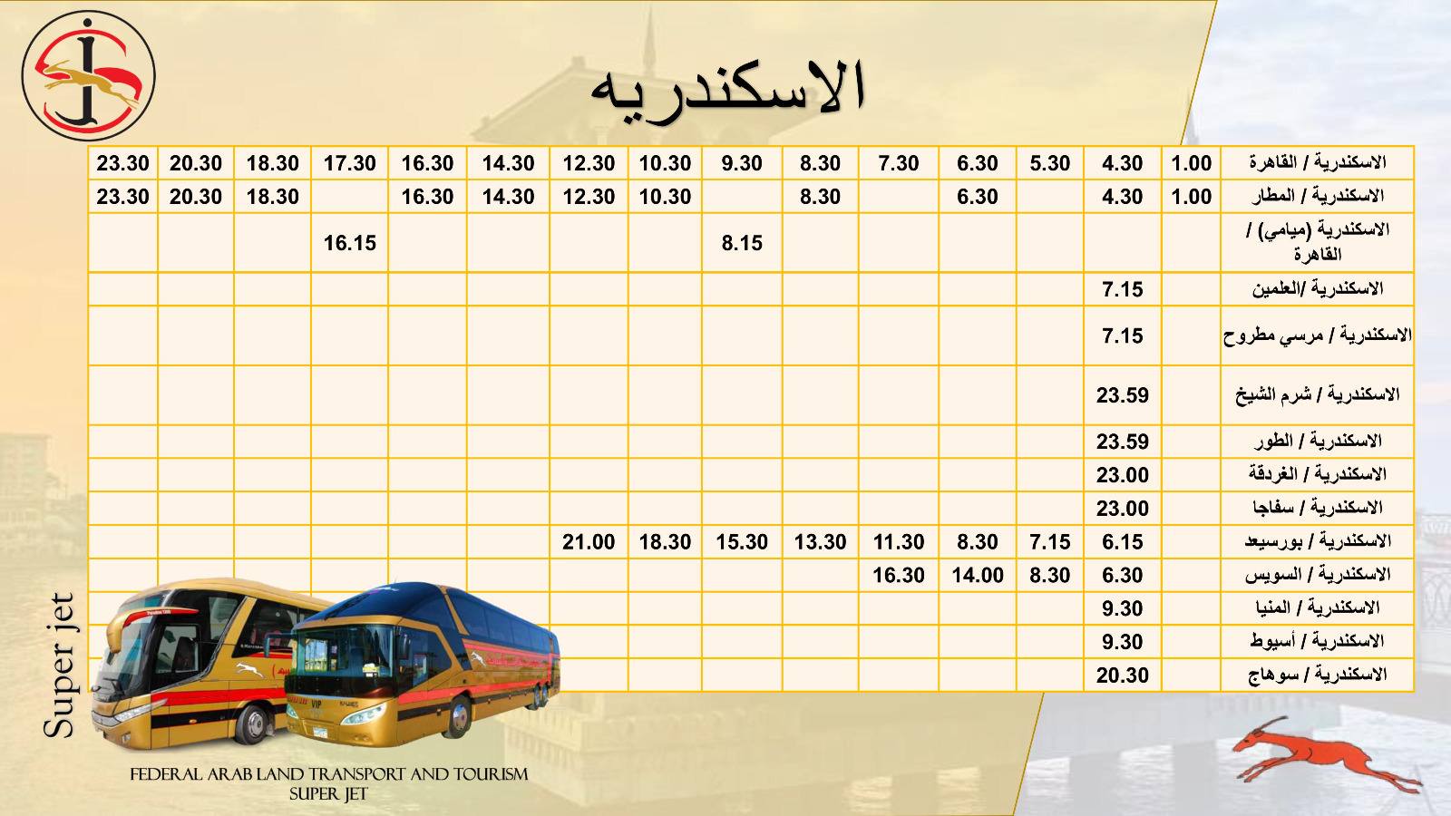تُسير شركة الاتحاد العربي للنقل البري والسياحة سوبر جيت، إحدى الشركات التابعة لوزارة النقل، عدد من خدمات نقل الركاب الداخلية والخارجية إلى مختلف المحافظات من خلال أسطول من الحافلات المتميزة، كما تمتلك العديد من المحطات الذكية وأنظمة الحجز الإلكتروني.