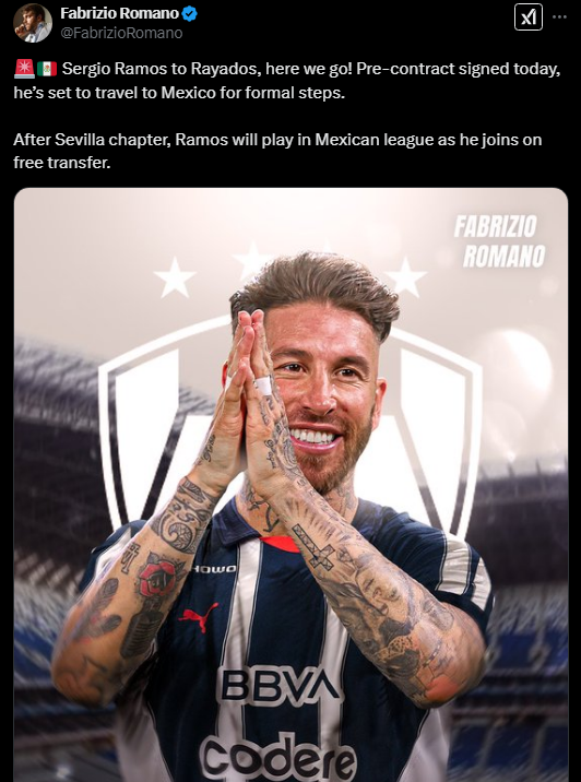 وأضاف: بعد انتهاء عقد إشبيلية، سيلعب راموس في الدوري المكسيكي حيث ينضم إليه في صفقة انتقال حر.