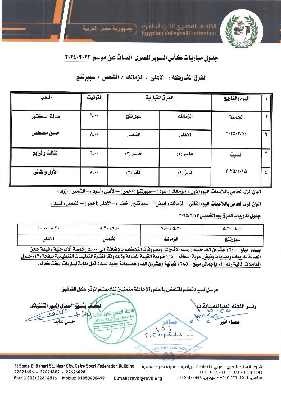 * المباراة النهائية: الفائز من المباراة الأولى × الفائز من المباراة الثانية - السبت 15 فبراير 2025، الساعة 8 مساءً، على صالة حسن مصطفى.