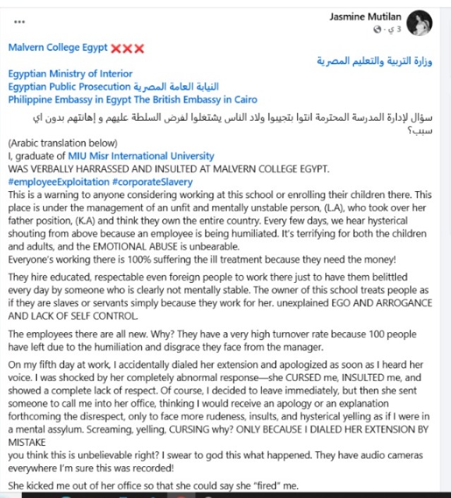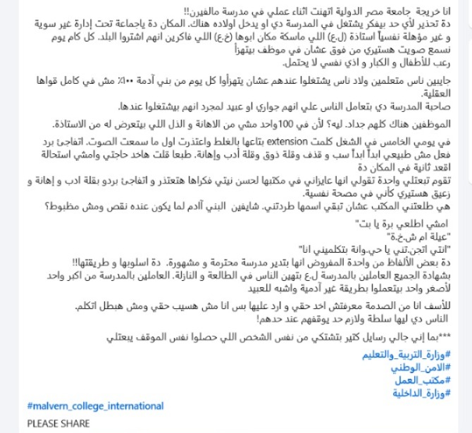 اشتكت معلمة تدعى جاسمين من إدارة مدرسة مالفيرن كولدج Malvern College Egypt، ومن سوء معاملتها للعاملين بداخلها.
