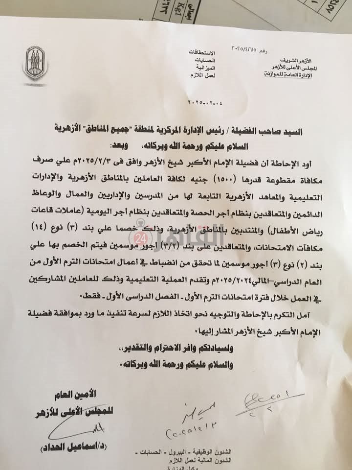 وجاء نص القرار الذي حصل القاهرة 24 على نسخة منه كالتالي: رئيس الإدارة المركزية لمنطقة جميع المناطق الأزهرية، أود الإحاطة أن فضيلة الإمام الأكبر شيخ الأزهر وافق في يوم الاثنين الموافق الـ3 من فبراير الجاري على صرف مكافأة مقطوعة قدرها 1500 جنيه لكل العاملين بالمناطق الأزهرية والإدارات التعليمية والمعاهد الأزهرية التابعة لها، من المدرسين والإداريين والعمال والوعاظ الدائمين والمتعاقدين بنظام أجر الحصة والمتعاقدين بنظام أجر اليومية: عاملات قاعات رياض الأطفال، والمنتدبين بالمناطق الأزهرية، وذلك خصما علي بند 3 نوع 14 مكافآت الامتحانات والمتعاقدين على بند 3/2 أجور موسمين فيتم الخصم بها على بند 2 نوع 3 أجور موسمين، لما تحقق من انضباط في أعمال امتحانات الترم الأول من العام الدراسي المالي 2024-25 وتقدم العملية التعليمية وذلك للعاملين المشاركين في العمل خلال فترة امتحانات الترم الأول الفصل الدراسي الأول فقط.