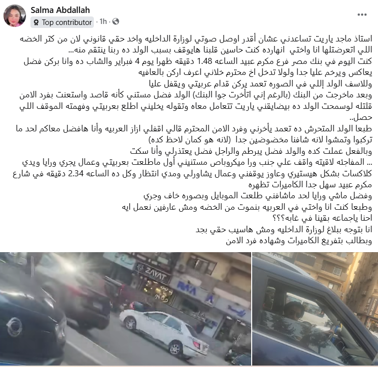 وأضافت سلمى خلال منشورها: بعد ما خرجت من البنك، لقيته لسه مستنيني، واستعنت بفرد الأمن وقلت له الولد ده بيضايقني، وفعلًا حاول يساعدني، لكن الشاب كان قاصد يعطلني، رغم أني اتأخرت في البنك، مؤكدة أن رجل الأمن لاحظ حالة الخوف التي كانت عليها هي وشقيقتها، فطلب منها غلق نوافذ السيارة وتعهد بالبقاء معهما حتى تتحركا بأمان.