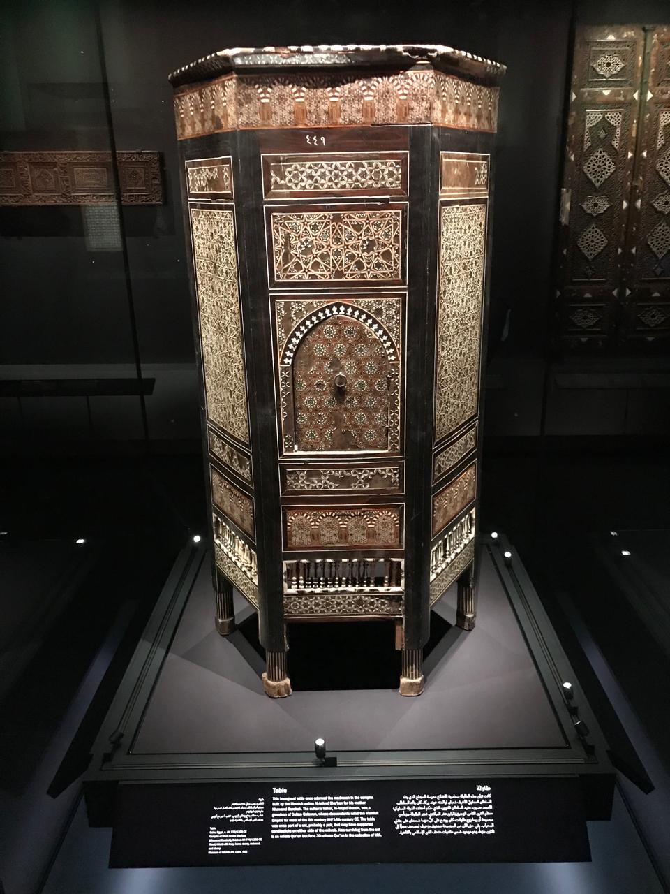 ومن جانبه أوضح الدكتور جمال مصطفى، أن البينالى سوف يستمر حتى شهر مايو من العام الجاري، وأن المجلس الأعلى للآثار يشارك بثماني قطع أثرية من مقتنيات متحف الفن الإسلامي بالقاهرة، من بينها محراب وضلفتى باب من الخشب من مسجد السيدة نفيسة من العصر الفاطمي، عليهم كتابات كوفية وزخارف نباتية، وجزء من تابوت خشبى به كتابات عربية، وقطعتين من الفسيفساء المزينة بزخارف هندسية بالإضافة إلى كرسي خشب مسدس الشكل مطعم بالسن والأبنوس والخشب الأحمر.