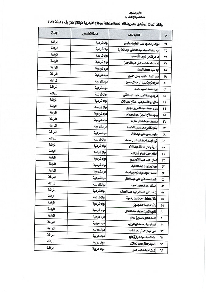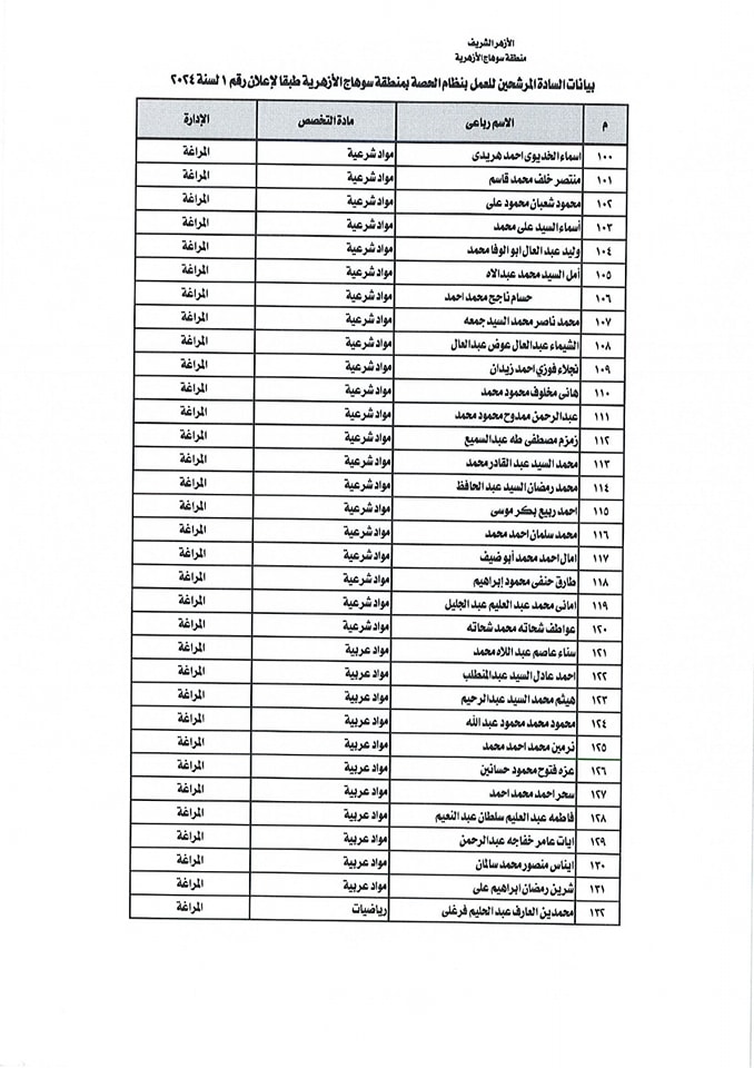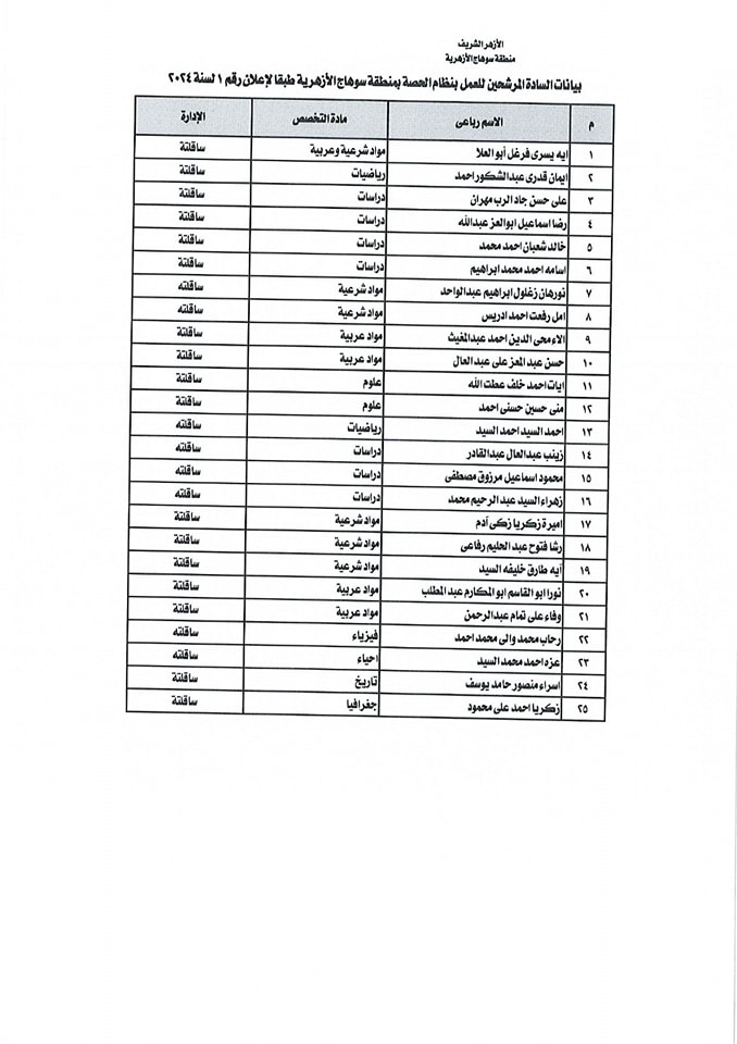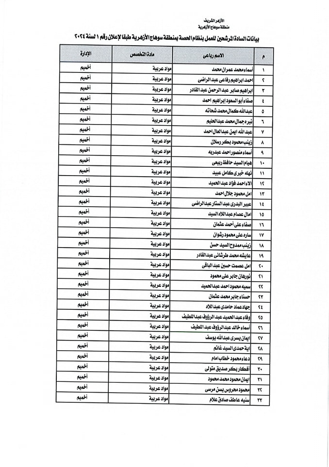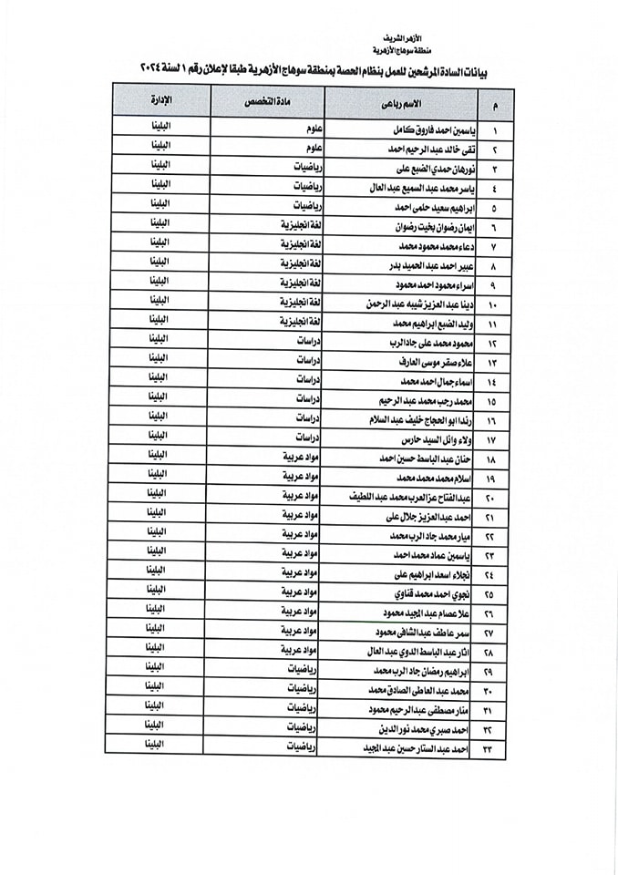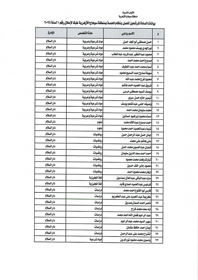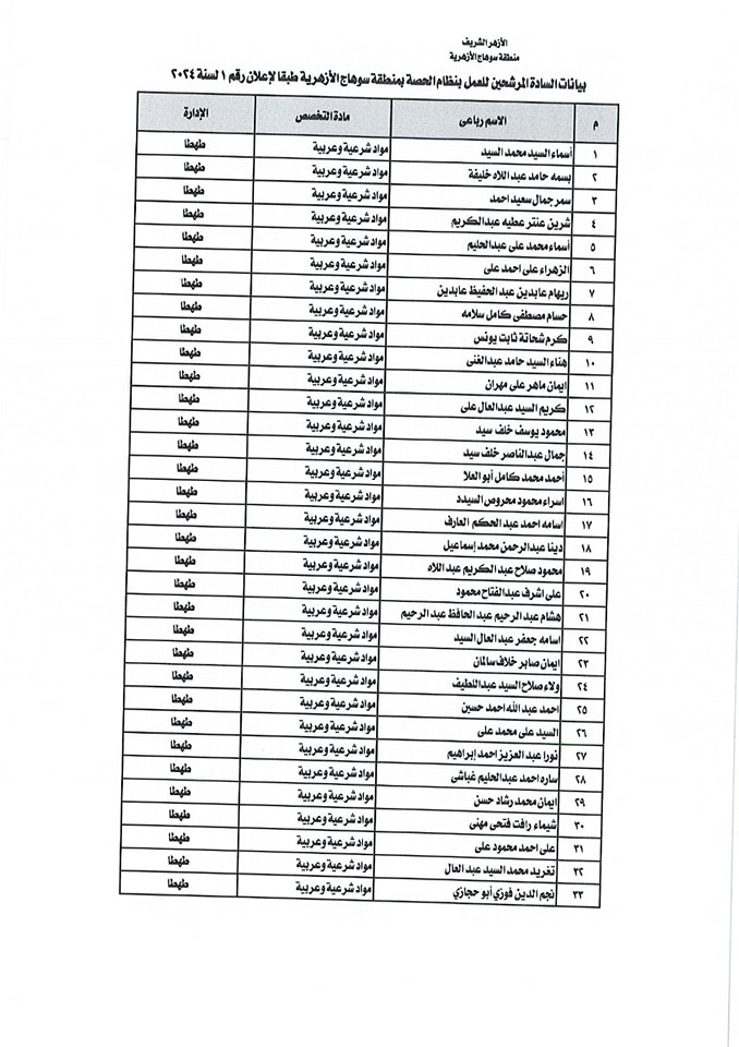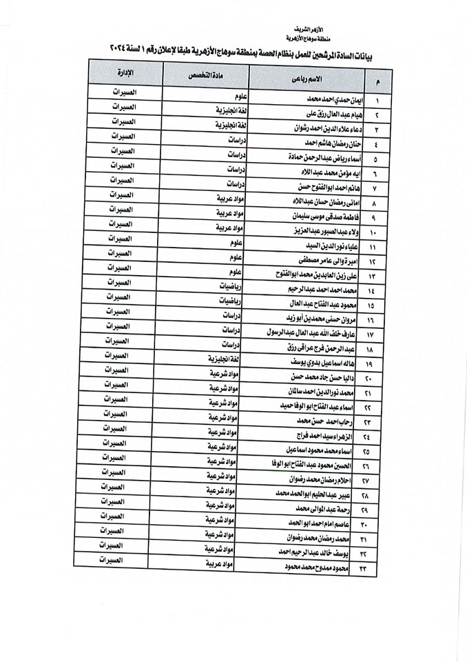 ننشر أسماء المقبولين في مسابقة معلمي الحصة بمنطقة سوهاج الأزهرية