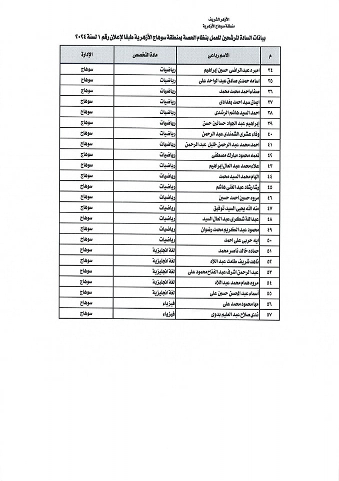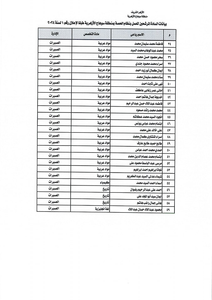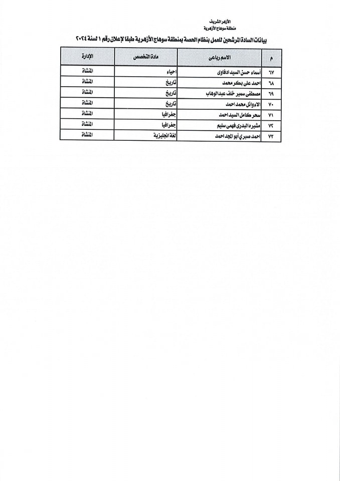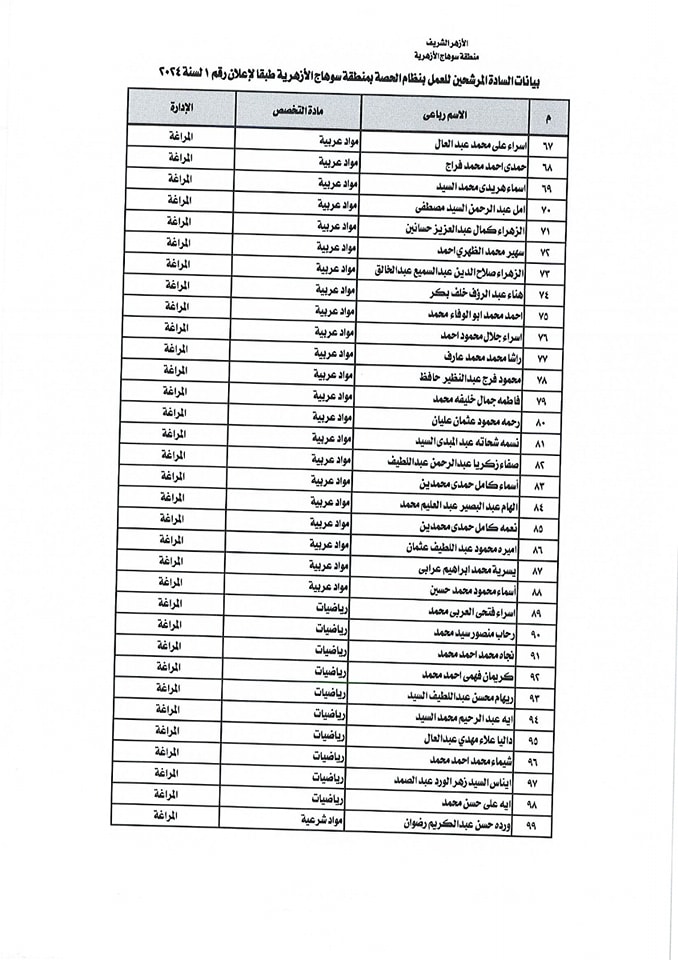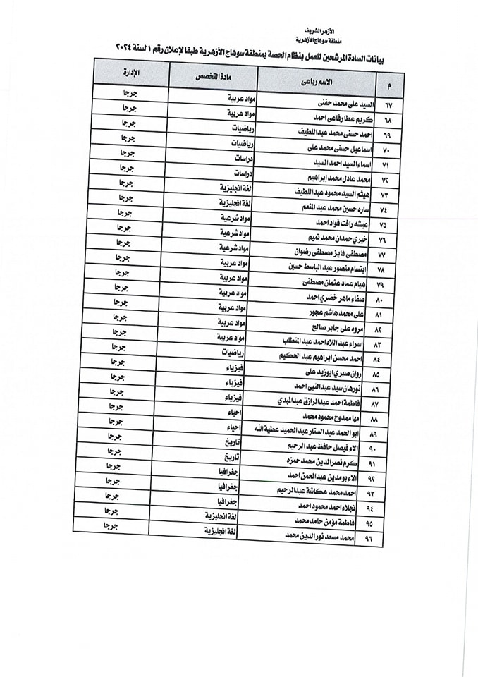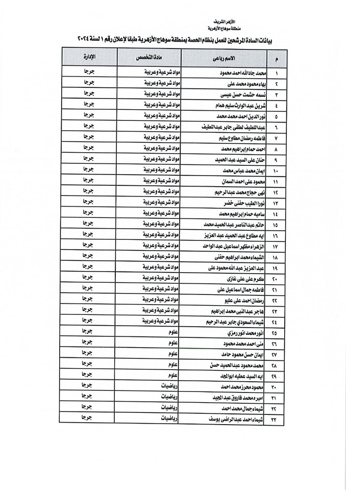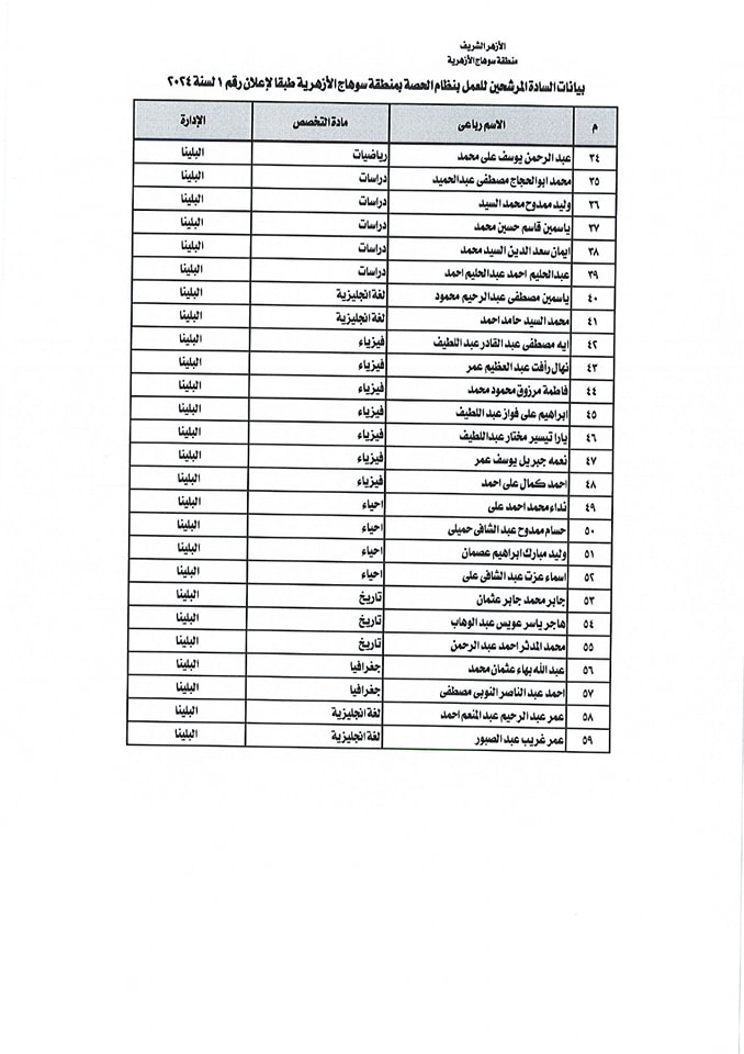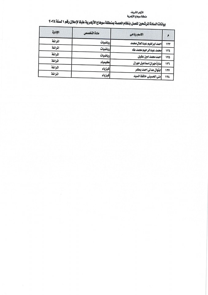 ننشر أسماء المقبولين في مسابقة معلمي الحصة بمنطقة سوهاج الأزهرية