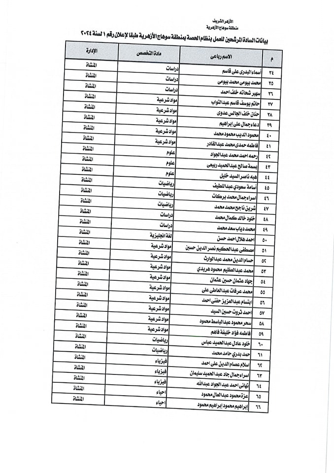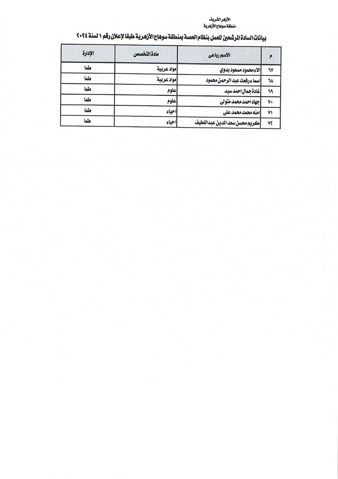 أسماء المقبولين بالحصة في منطقة سوهاج الازهرية