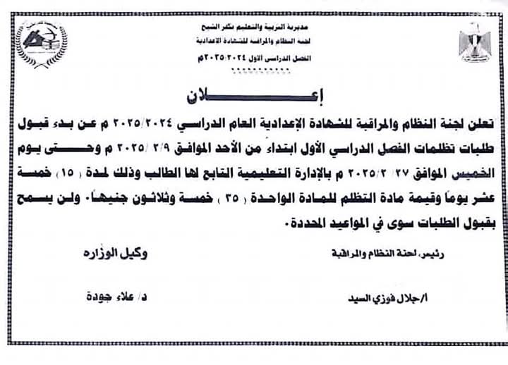 تعليم كفر الشيخ تعلن عن موعد بدء تلقي تظلمات الشهادة الإعدادية| مستند