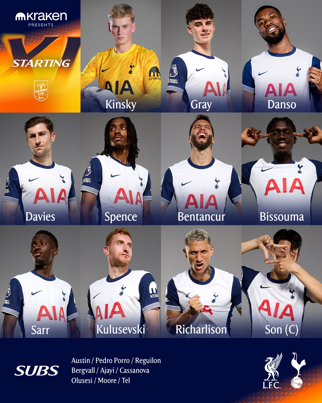 وأعلن المدرب الأسترالي أنجي بوستيكوجلو، المدير الفني لفريق توتنهام عن التشكيل الرسمي الذي سيخوض به مباراة ليفربول في كأس الكاراباو، والذي جاء على الشكل التالي:ـ