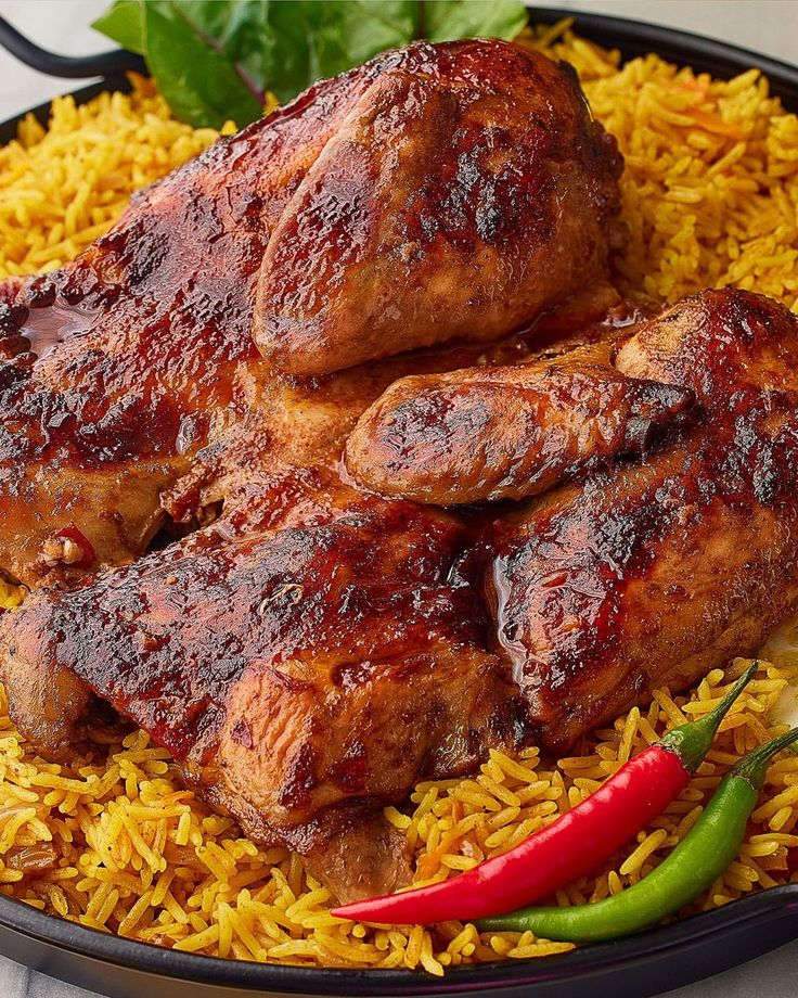 - وضع الدجاجة والفحمة على الأرز البسمتي مباشرة.