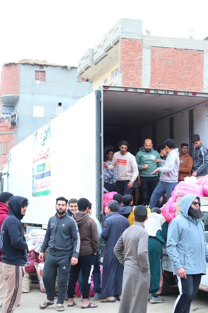 أهالي منشأة عبد الرحمن بالدقهلية يجمعون أطنان من المواد الغذائية والمستلزمات لإرسالها إلى غزة| صور