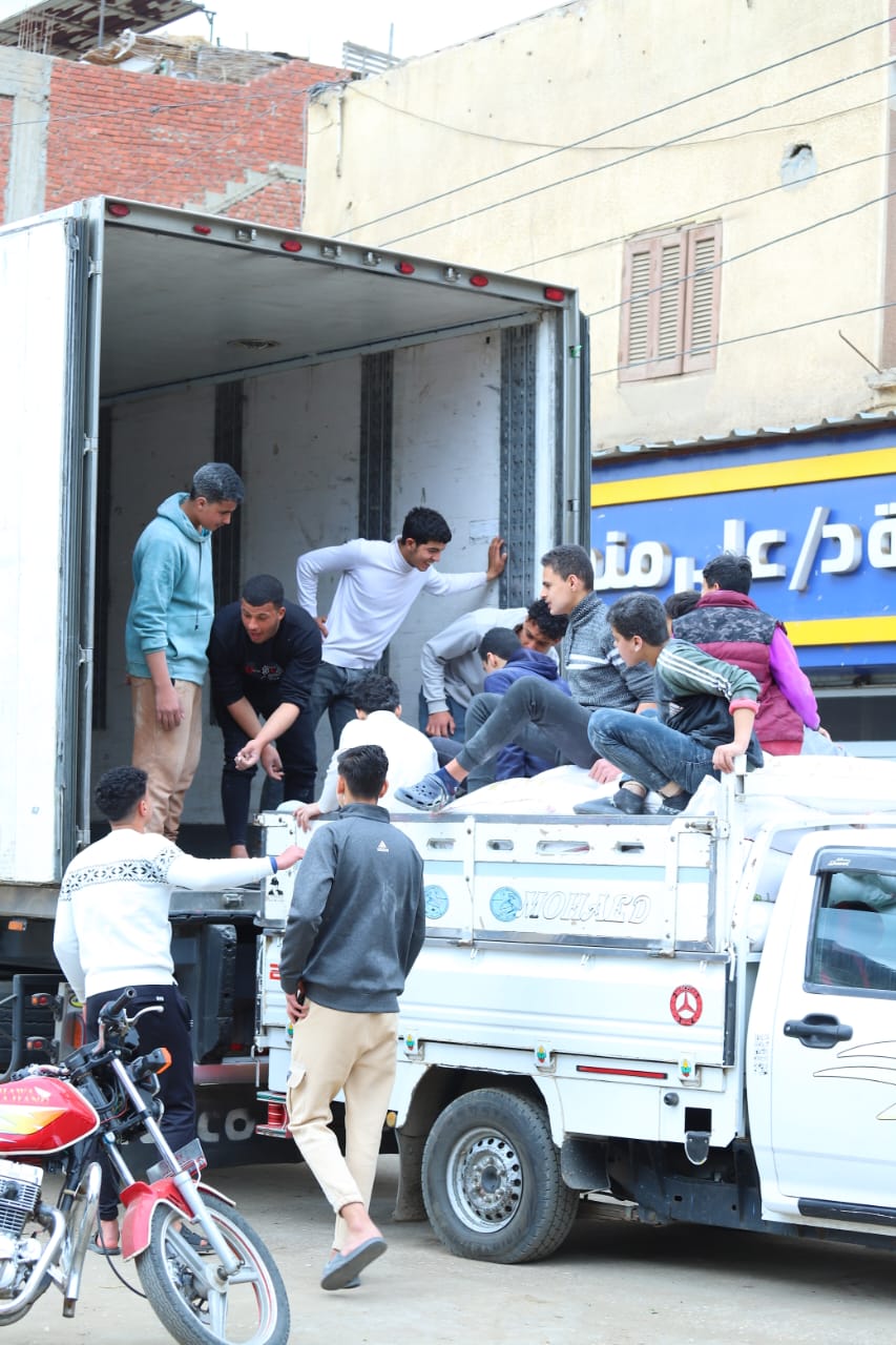 أهالي منشأة عبد الرحمن يجمعون أطنان من المواد الغذائية والمستلزمات لإرسالها إلى غزة