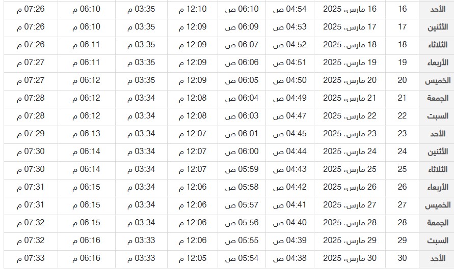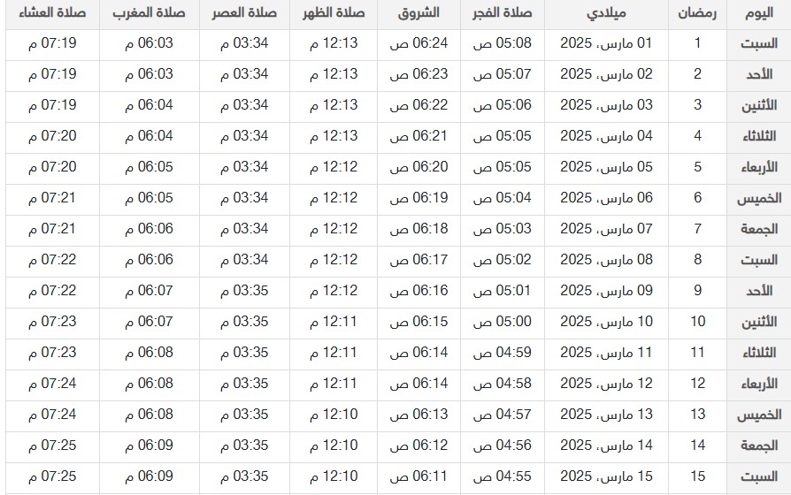 وحول مواقيت الصلاة في رمضان 2025 بالمملكة العربية السعودية، فإننا نعرض الجدول الذي يضمن مواعيد الصلاة خلال الـ 30 يوما في رمضان، وكذلك وقت السحور والتي تكون كالآتي: