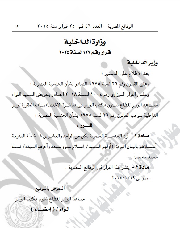 كما جاء في القرار الثاني رقم 127 لسنة 2025، ما تضمن بشأن رد الجنسية المصرية لـ21 شخصًا آخرين، أولهم إسلام عمرو سعد، وآخرهم نسمة محمد محمد.