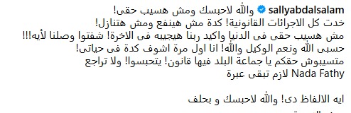 ونشرت سالي عبد السلام صورة من تعليق المتابع الذي سبها، وعلقت عليها قائلة: والله لاحبسك ومش هسيب حقي، خدت كل الإجراءات القانونية، كدة مش هينفع ومش هتنازل مش هسيب حقي في الدنيا، وأكيد ربنا هيجيبه في الآخرة شفتوا وصلنا لإيه!، حسبي الله ونعم الوكيل، والله أنا أول مرة أشوف كدة في حياتي، متسيبوش حقكم يا جماعة البلد فيها قانون يتحبسوا! ولا تراجع، لازم تبقى عبرة إيه الألفاظ دي والله لاحبسك وبحلف.