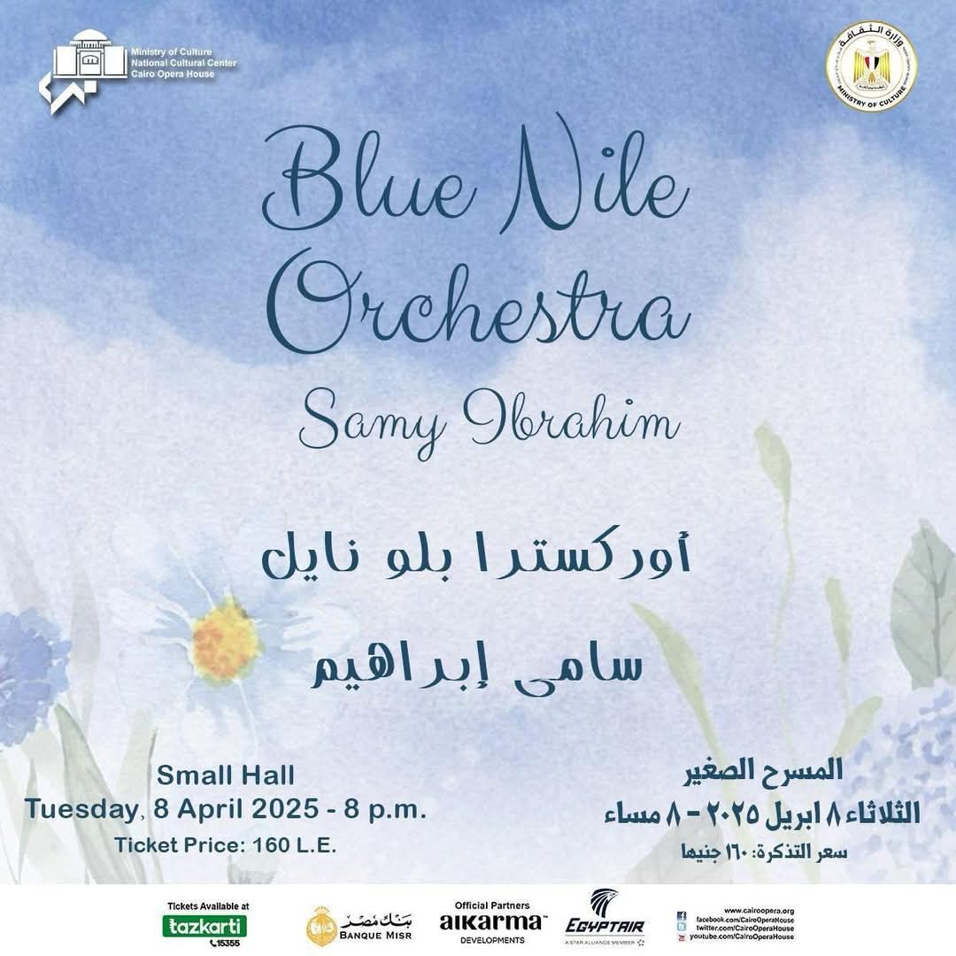 تقيم دار الأوبرا المصرية برئاسة الدكتور علاء عبد السلام حفلًا لأوركسترا بلو نايل إعداد وقيادة المايسترو سامي إبراهيم في الثامنة مساء الثلاثاء 8 أبريل على المسرح الصغير، وذلك ضمن أنشطة وزارة الثقافة.