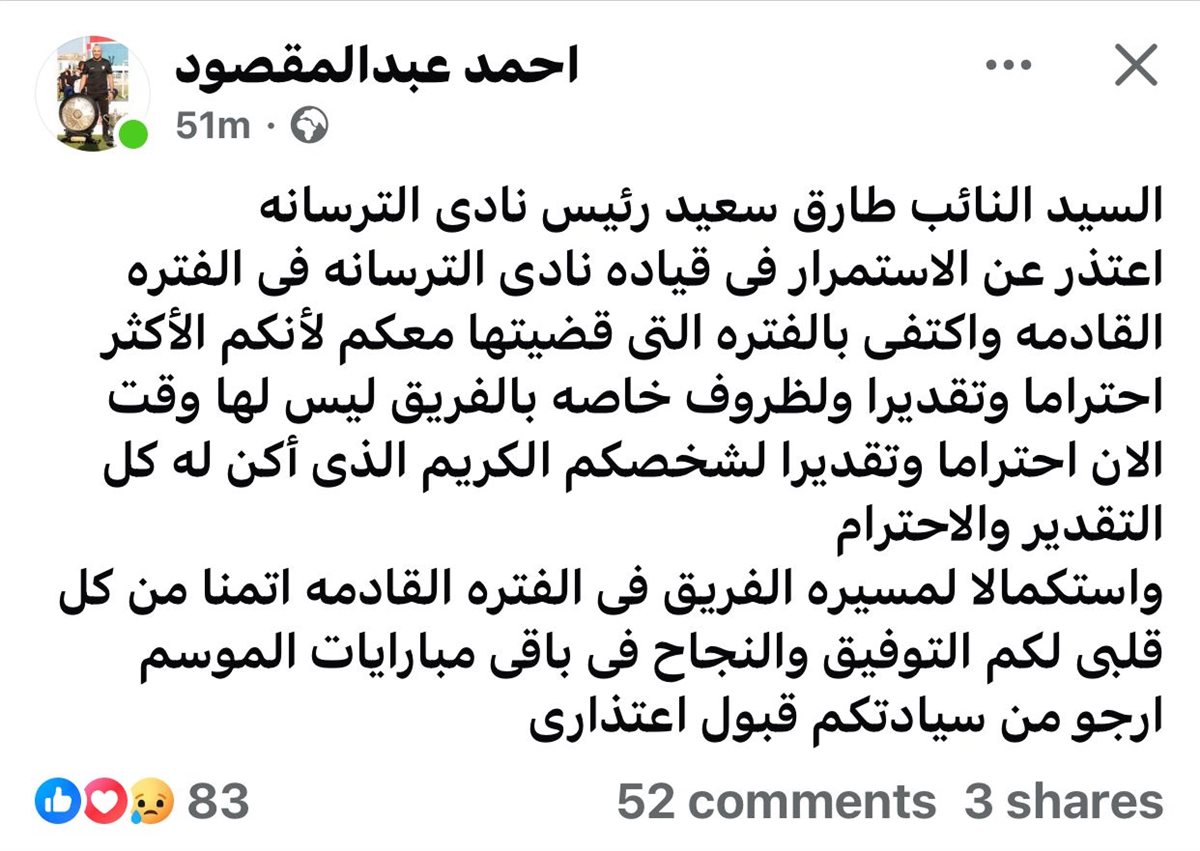 وتابع عبد المقصود في منشوره، “واستكمالا لمسيرة الفريق في الفترة القادمة أتمن من كل قلبي لكم التوفيق والنجاح في باقي مبارايات الموسم أرجو من سيادتكم قبول اعتذاري”.