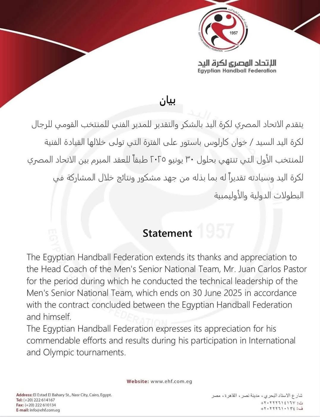 "يتقدم الاتحاد المصري لكرة اليد بالشكر والتقدير للمدير الفني للمنتخب القومي للرجال لكرة اليد خوان كارلوس باستور على الفترة التي تولى خلالها القيادة الفنية للمنتخب الأول التي تنتهي بحلول 30 يونيو 2025 طبقًا للعقد المبرم بين الاتحاد المصري لكرة اليد وسيادته تقديرًا له بما بذله من جهد مشكور ونتائج خلال المشاركة في البطولات الدولية والأوليمبية