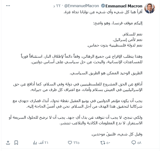 وقال ماكرون في تغريدة على منصة إكس: أقرأ هنا كل شيء وأي شيء عن نوايانا تجاه غزة، إليكم موقف فرنسا، وهو واضح: نعم للسلام.. نعم لأمن إسرائيل.. نعم لدولة فلسطينية بدون حماس.