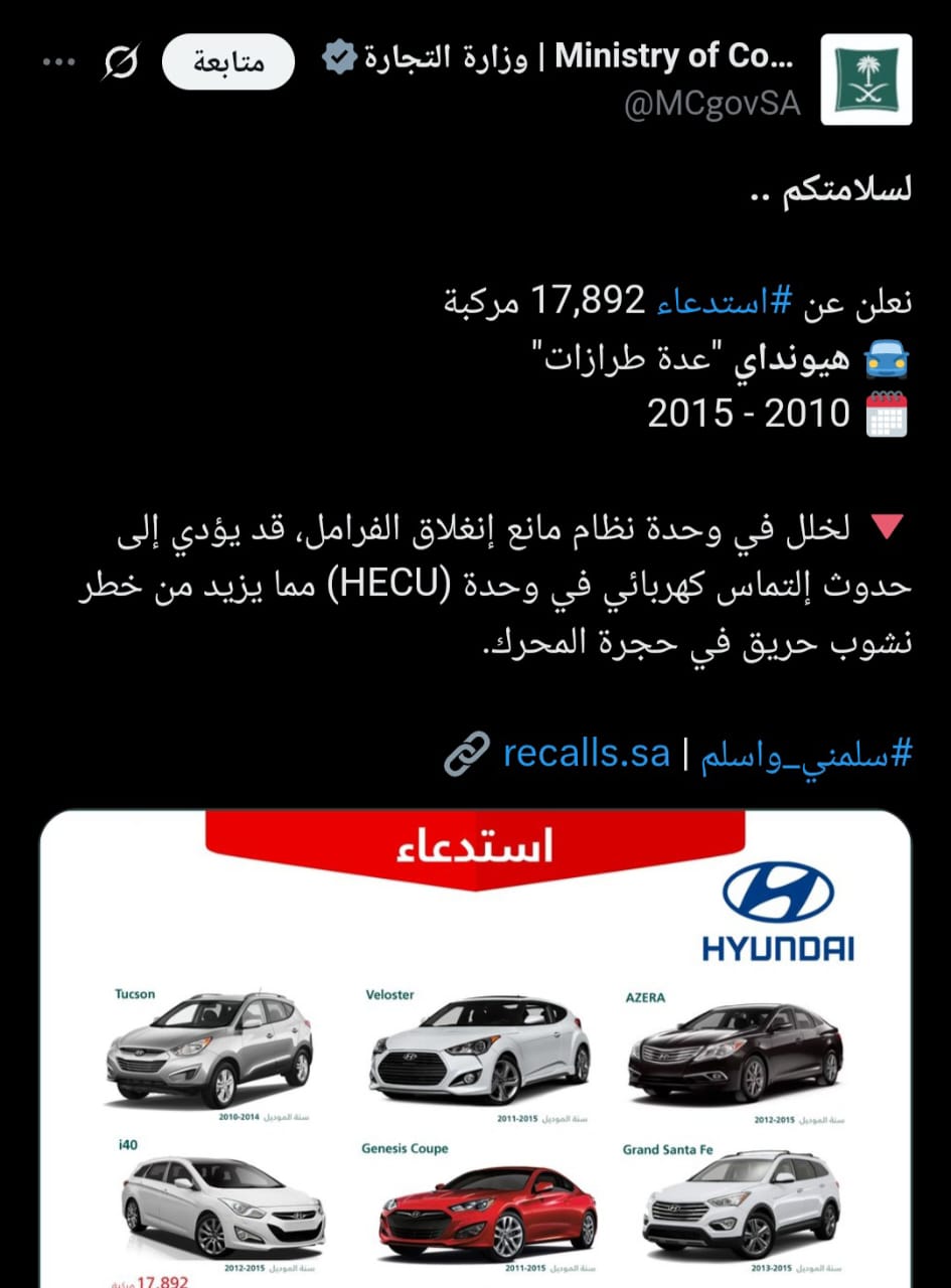 أعلنت وزارة التجارة السعودية عبر حسابها الموثق على منصة إكس عن عملية استدعاء لنحو 17،892 ألف سيارة هيونداي.