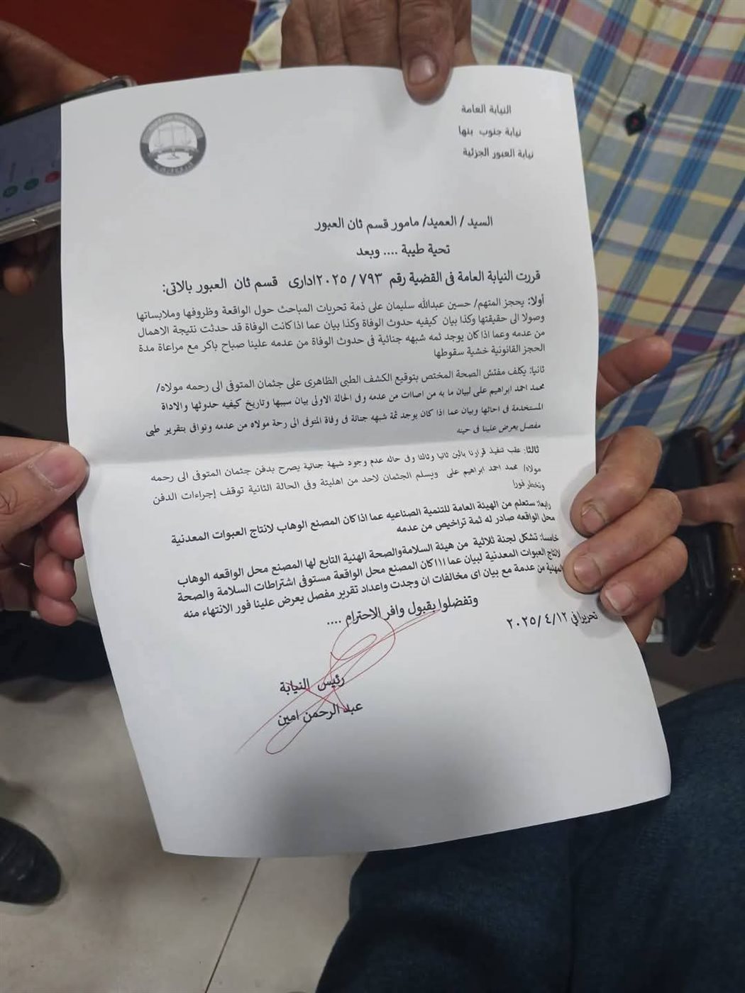 وأصدرت النيابة العامة بالعبور 5 قرارات، أولا يحجز المتهم ح.ع علي ذمة تحريات المباحث حول الواقعة وظروفها وملابساتها وصولا إلي حقيقتها وكذا بيان كيفية حدوث الوفاة وبيان عما إذا كانت الوفاة قد حدثت نتيجة الإهمال من عدمه وإذا كان يوجد ثمة شبهة جنائية في الوفاة من عدمه، مع مراعاة مدة الحجز القانونية خشية سقوطها.