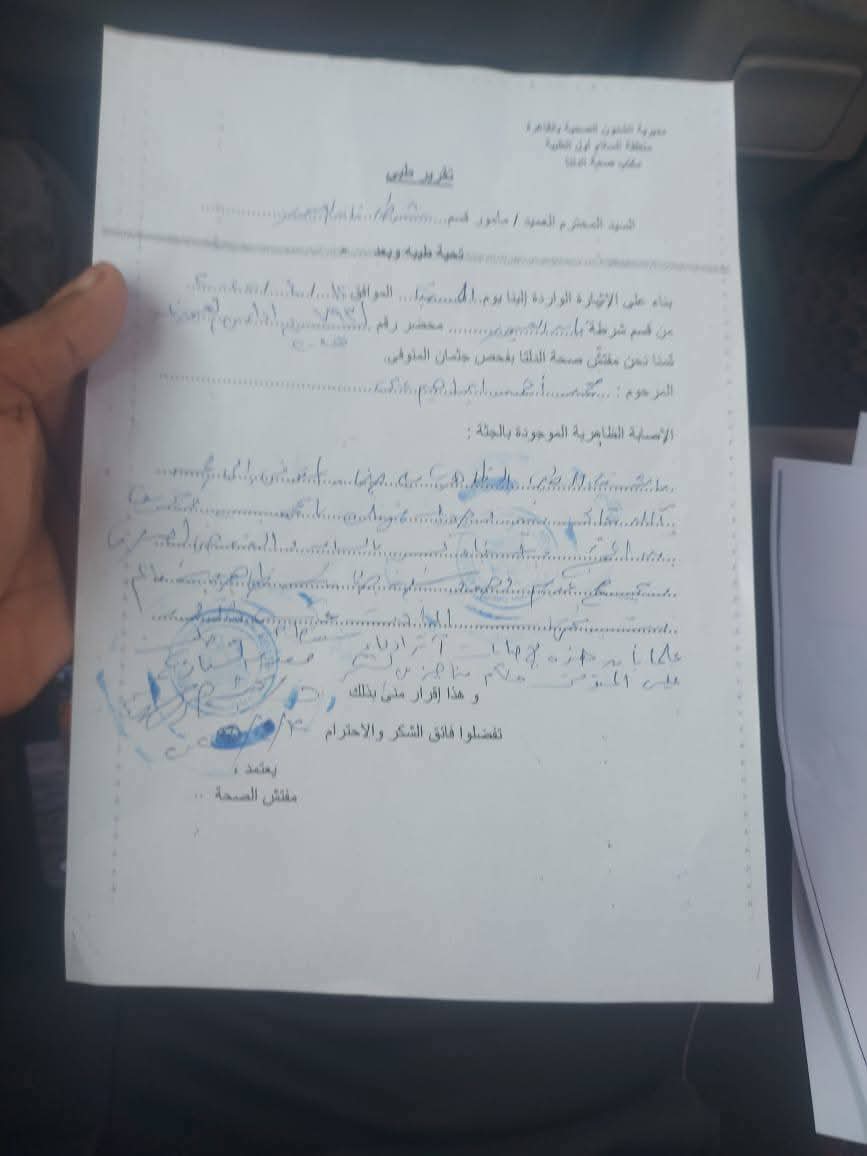ثانيا: يكلف مفتش الصحة المختص بتوقيع الكشف الطبي الظاهري علي جثمان المتوفي لبيان ما به من إصابات من عدمه وفي الحالة الأولي بيان سببها وتاريخ كيفية حدوثها والاداة المستخدمة في احداثها وبيان إذا كان يوجد ثمة شبهة جنائية في الوفاةمن عدمه وتوافي بتقرير طبي مفصل.