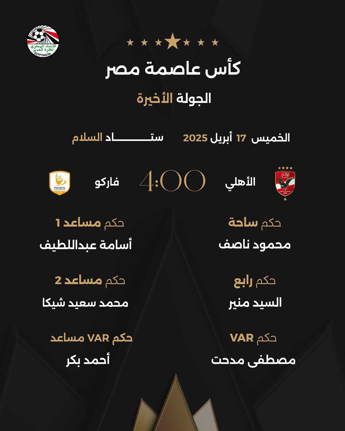 أعلنت لجنة الحكام الرئيسية بقيادة أوسكار رويز طاقم حكام مباراة الأهلي وفاركو، والتي تأتي ضمن منافسات الجولة الأخير بدور المجموعات ببطولة كأس عاصمة مصر للموسم الرياضي 2024-2025.