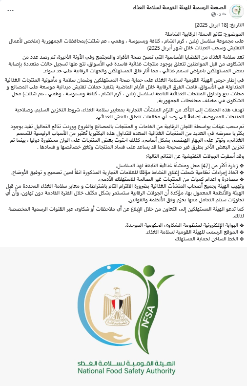 وتم سحب عينات بواسطة اللجان الرقابية من الخامات والمنتجات بالمصانع والفروع، ووردت نتائج التحاليل تفيد بوجود بكتيريا ممرضه في العديد من المنتجات الغذائية المعده للتداول هذه البكتيريا تُعتبر من الأسباب الرئيسية للتسمم الغذائي، وتؤثر على الجهاز الهضمي بشكل أساسي.. كذلك احتوت بعض المنتجات على ألوان محظورة دوليا بينما تم تخزين بعض المواد الأخرى بطرق غير صحيحة مما قد يساعد على فساد المنتجات وتغيّر خصائصها وفسادها، وبناء على ذلك قررت الهيئة إغلاق النشاط مؤقتًا للعلامات التجارية لحين تصحيح وتوفيق الأوضاع.