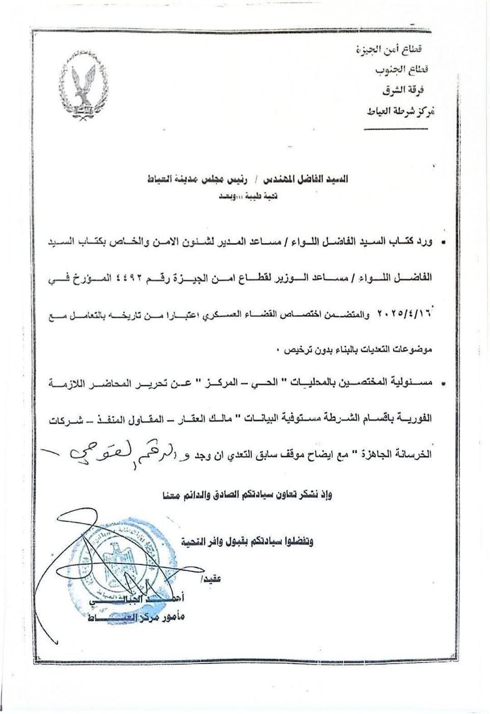 واختتم الخطاب بتوجيه الشكر إلى رئيس مجلس مدينة العياط على تعاونه الصادق والدائم، مع التمنيات باستمرار التنسيق المشترك، حفاظًا على أرواح المواطنين وفرض الانضباط في ملف التعديات.