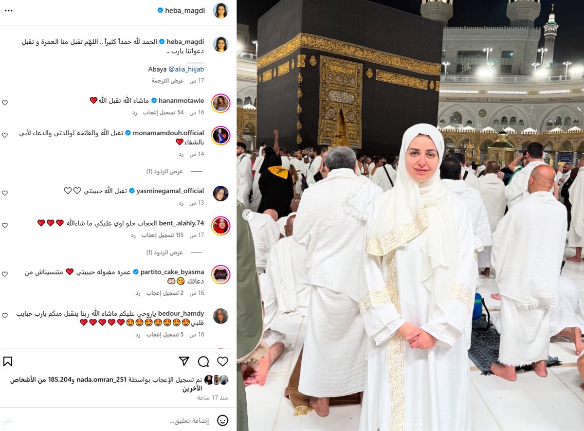 شاركت الفنانة هبة مجدي متابعيها بعدة صور لها، من أدائها مناسك العمرة، حيث نالت تلك الصور على إعجاب جمهورها، داعين الله أن يتقبل عمرتها.