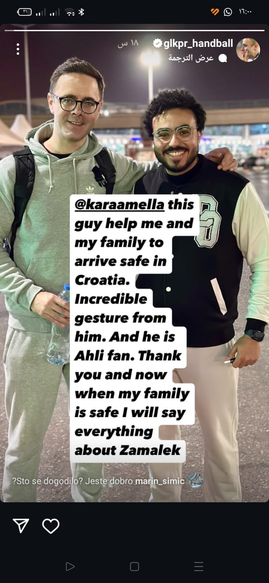 يذكر أن ماركو كتب عبر حسابه الرسمي على انستجرام: أشكر هذا الرجل على مساعدته لي ولعائلتي على الوصول بسلام لكرواتيا رغم أنه مشجع للأهلي، وعندما أتأكد أن عائلتي بأمان سأكشف كل شيء عن الزمالك.