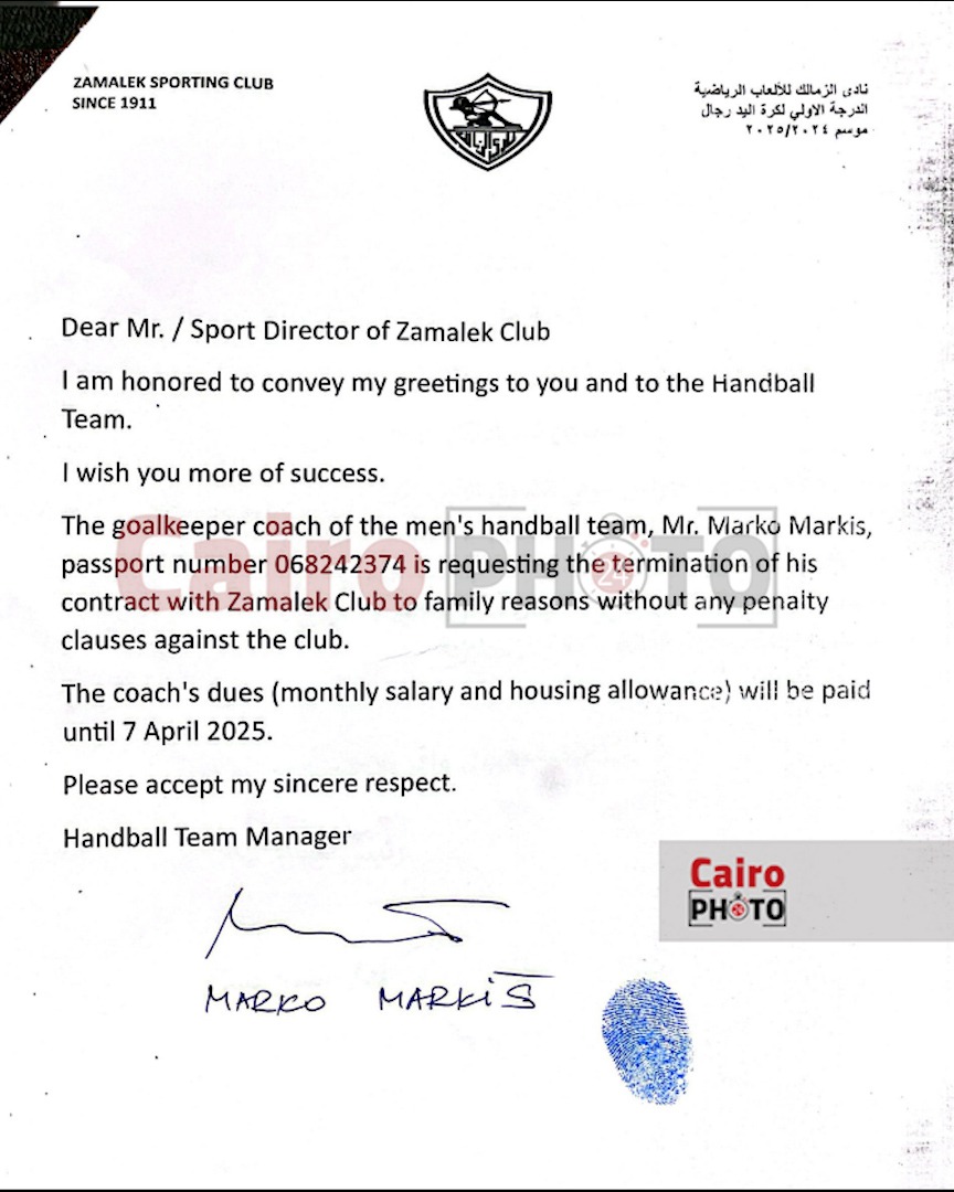 القاهرة 24 يكشف تفاصيل رحيل مدرب حراس يد الزمالك عن الفريق