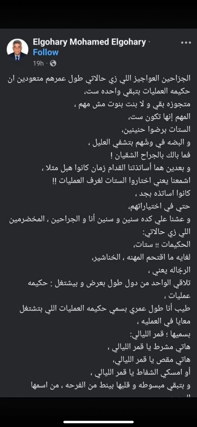 وتابع الدكتور الجوهري: تفاجأت بردود الفعل حول المنشور، وذلك لأن الجميع من المقربين يعلم أنني أحترم التمريض ولا أسيء لأي أحد، قائلا: من يدقق في المنشور يرى أنني أشيد بالتمريض ودورهم، وأيضا يحمل دعابة شديدة وليس أي إساءة.